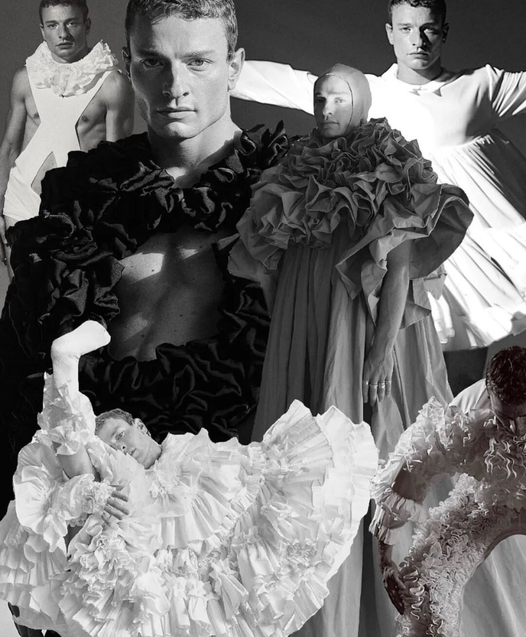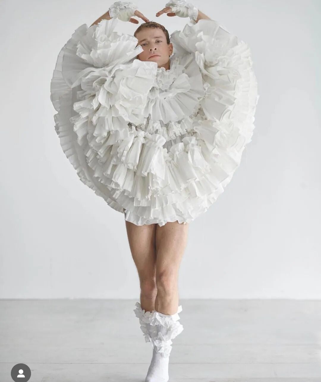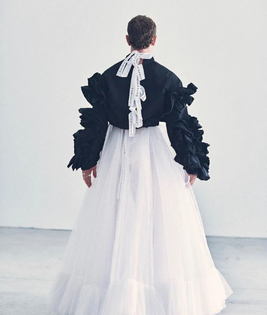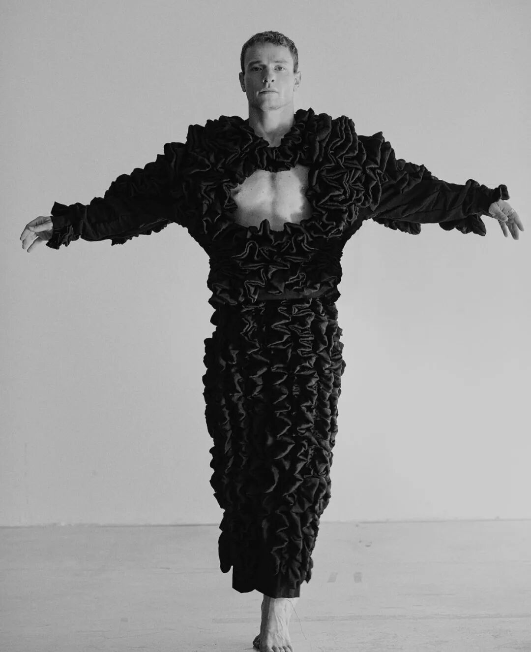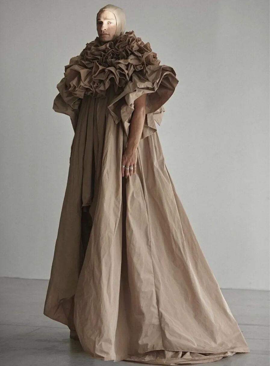 他将自己的文化和极具普通的“窗帘”融为一体,创造出纯白色的浪漫梦境,不规则的褶皱、大小交错的荷叶边,浪漫的蕾丝面料,丰富的垂褶布堆叠出戏剧化的三维效果,在风格上体现出前卫夸张的现代高科技特色。