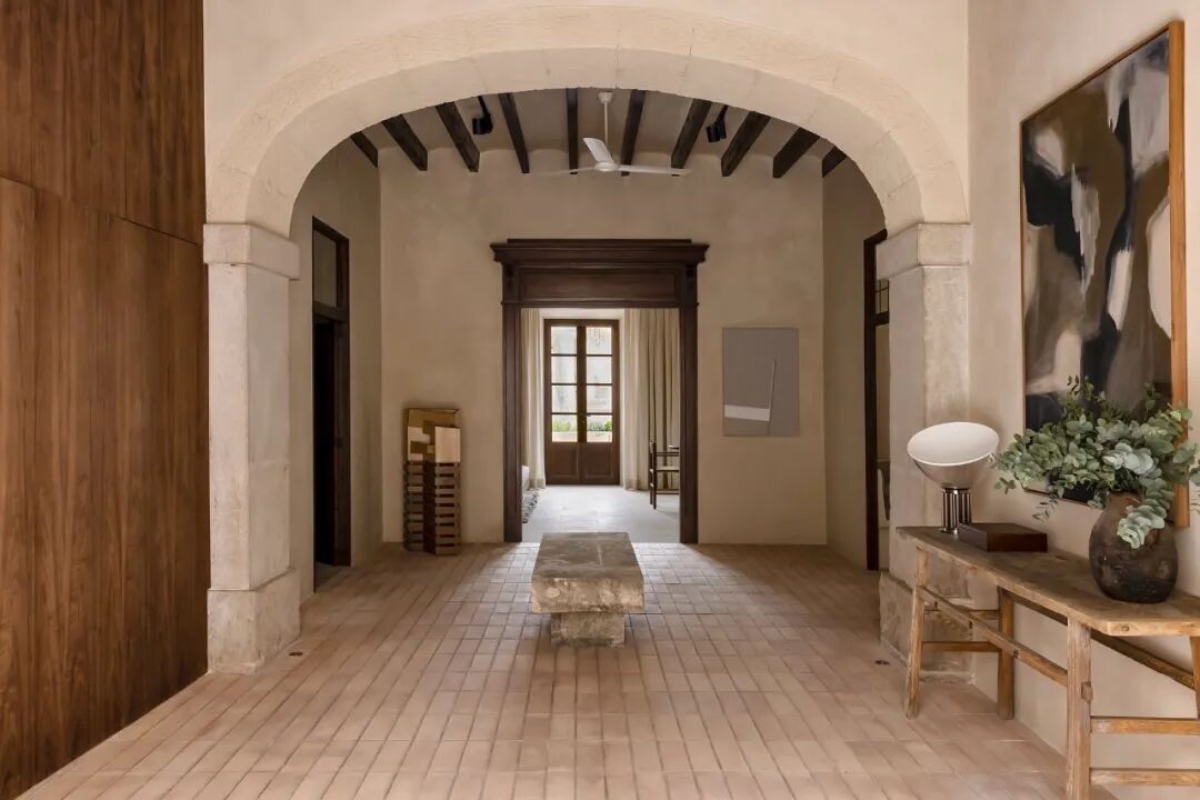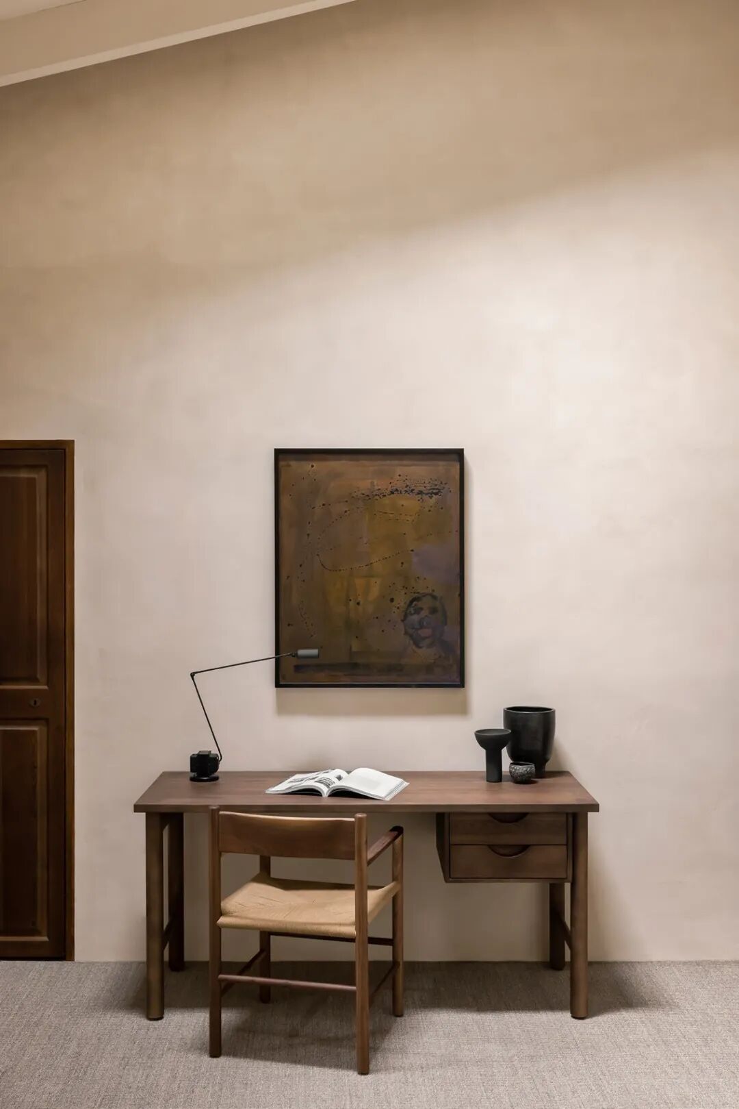 玄关保留了原有的建筑结构和历史细节,地砖以及拱门上的细节可以感受到历史韵味;看似简陋的木头桌子拥有使用过的痕迹,反而充满温度。