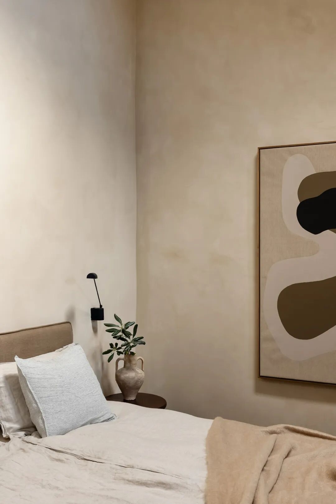 在卧室可以看到温和以及自然的材质,比如亚麻、羊绒、纯棉……并且全部铺设了短毛地毯,营造了一个温暖舒适的休憩空间。