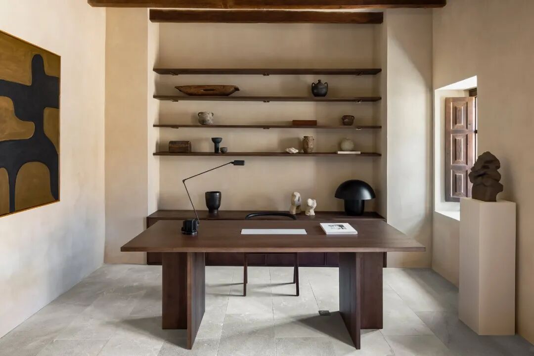 书房利用空间设置了置物架,将充满当地风情的器皿以及摆件放置在上面。