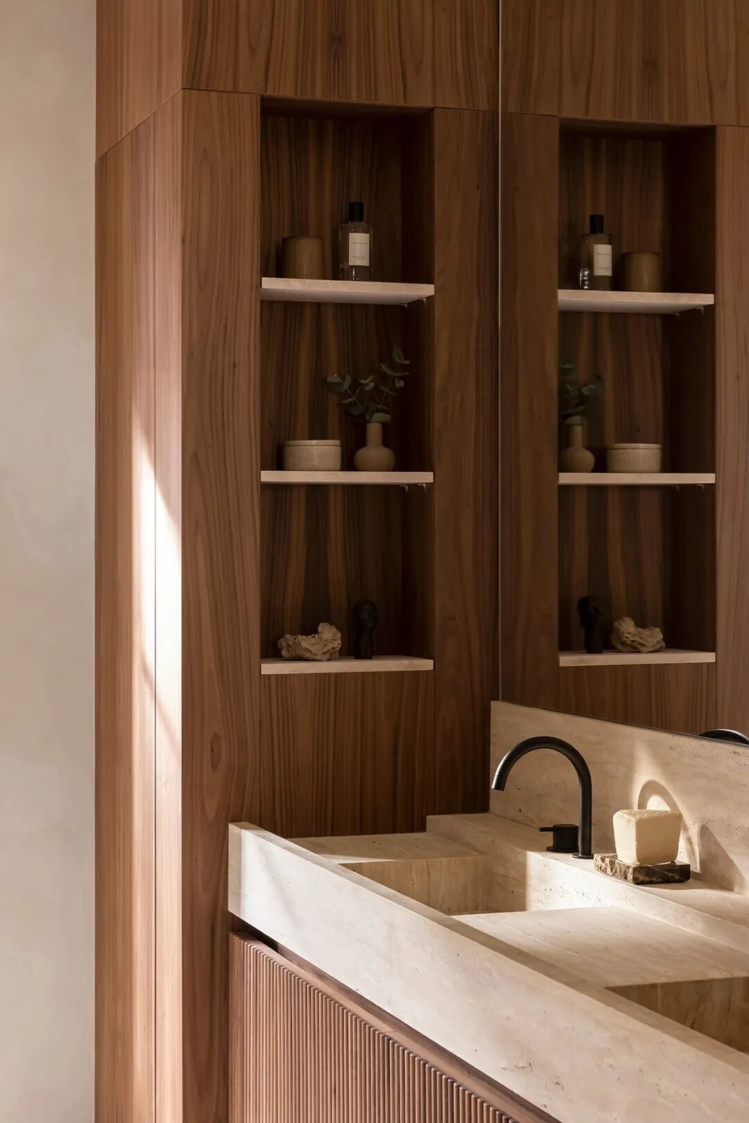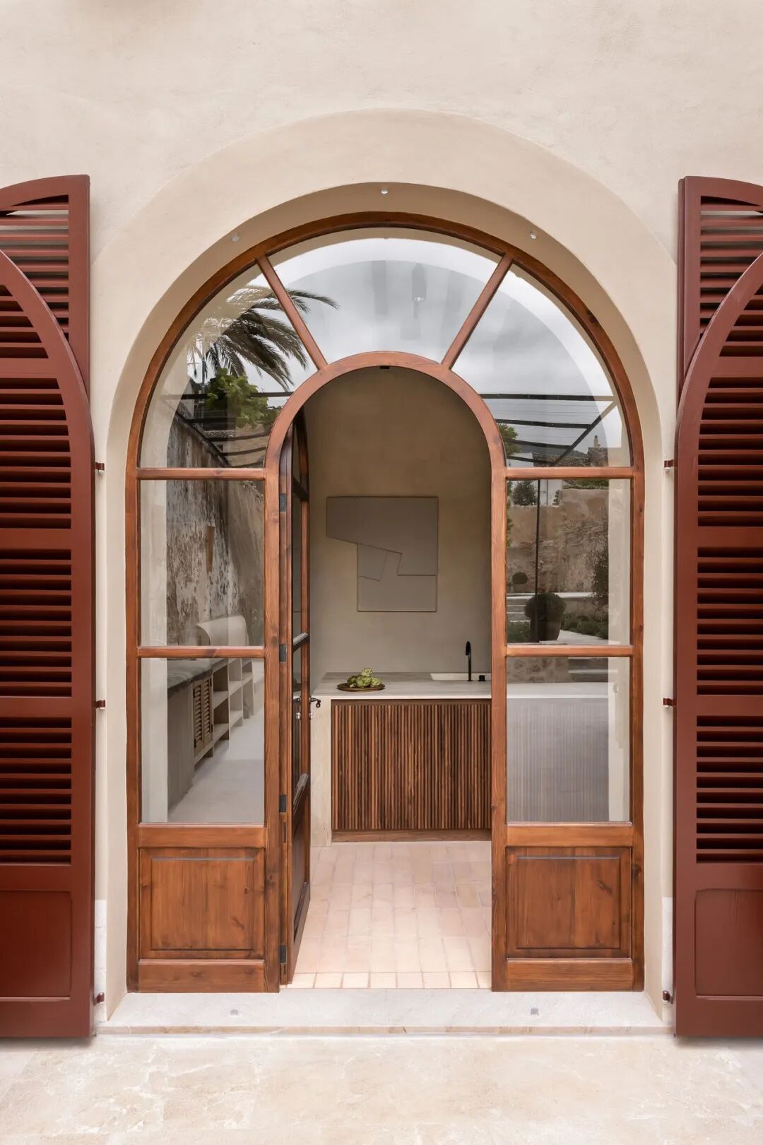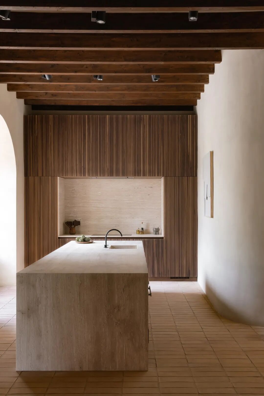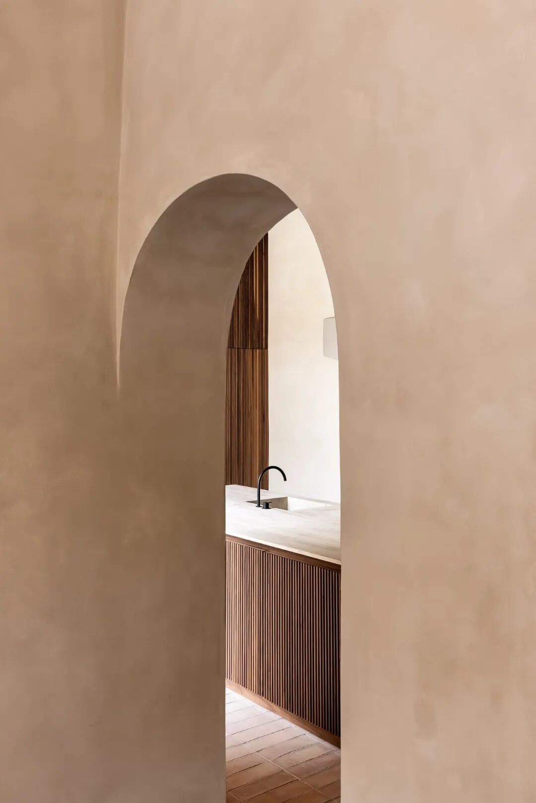 户外光线通过拱门玻璃窗洒进室内,照亮优雅沉稳的厨房区域。大量使用色调深浅不一的木材作为厨房空间中各个部分的柜体材料,营造出虚实结合的视觉效果以及古朴的空间风格。