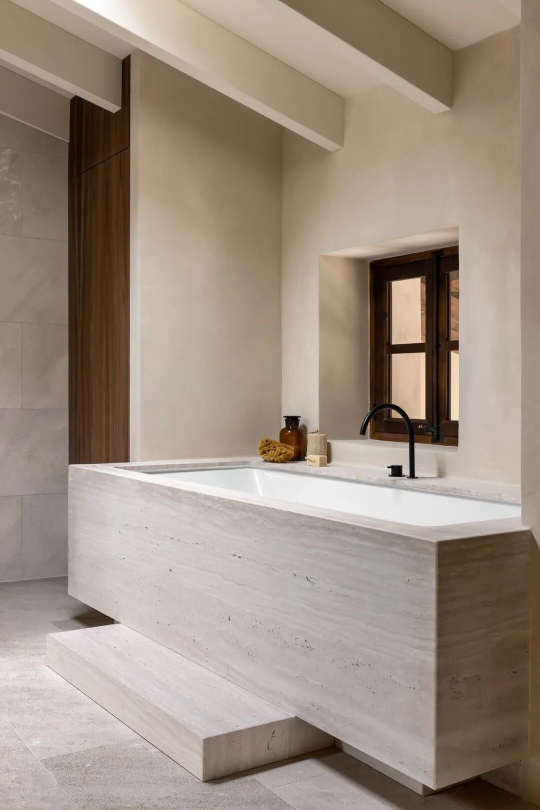 大理石浴缸上的花纹填补了纯色墙面的空白,赋予空间视觉上的层次感;浴缸下方的台阶给予了一种入浴前的仪式感。