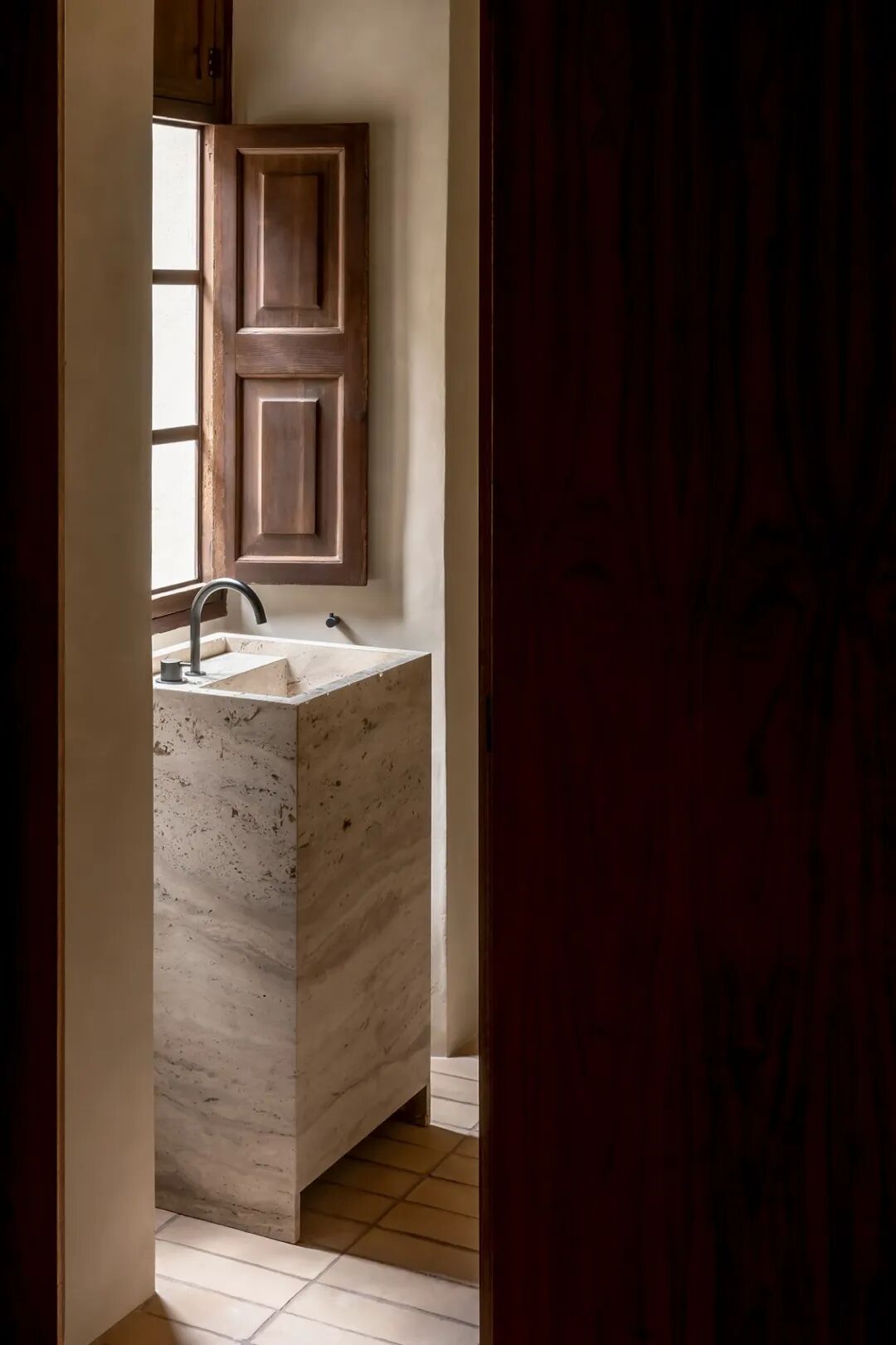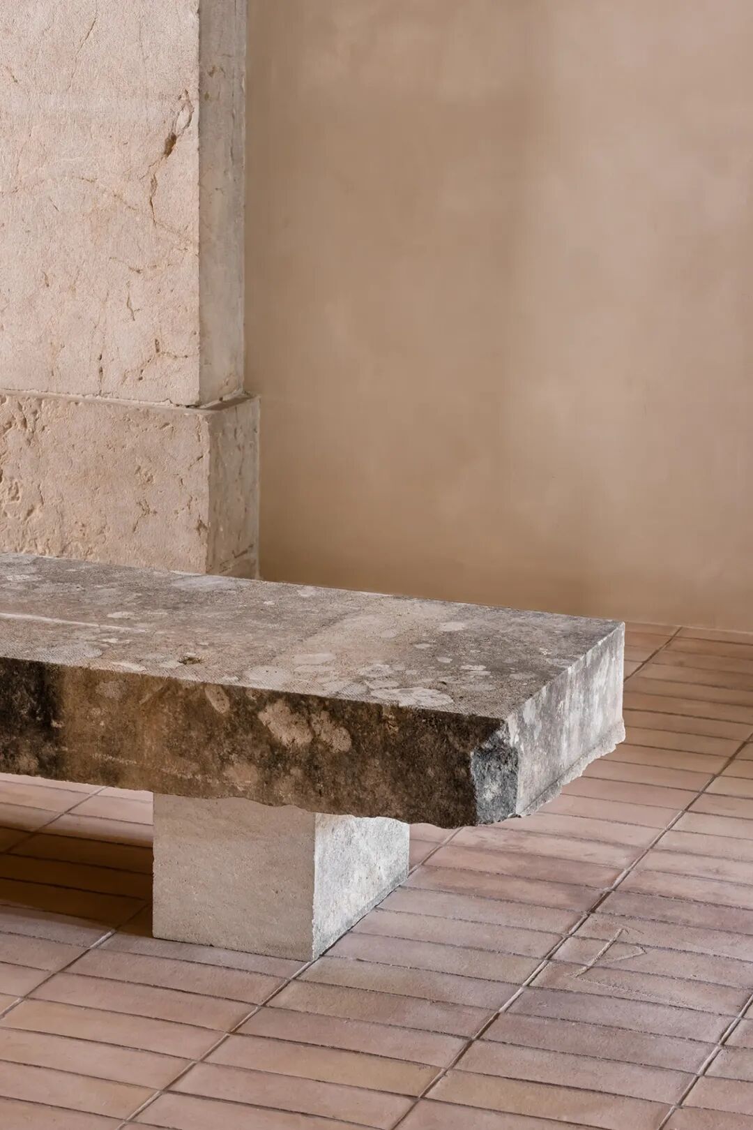 中央的石凳是翻新前便存在的部分,凹凸不平的石材肌理与周围的历史细节相得益彰。