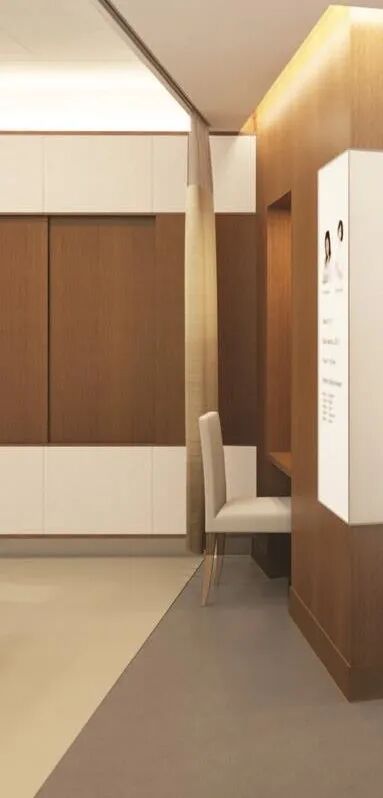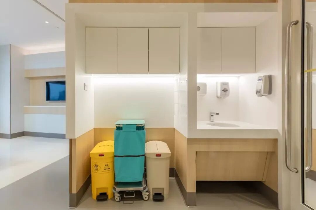 医护准备区的存放功能,从物理上规避人员和物品发生冲撞。墙饰面材料采用木纹pvc贴膜的护墙板,台盆部分采用可丽耐白色人造石,抗菌、无缝、耐磨,便于打理。