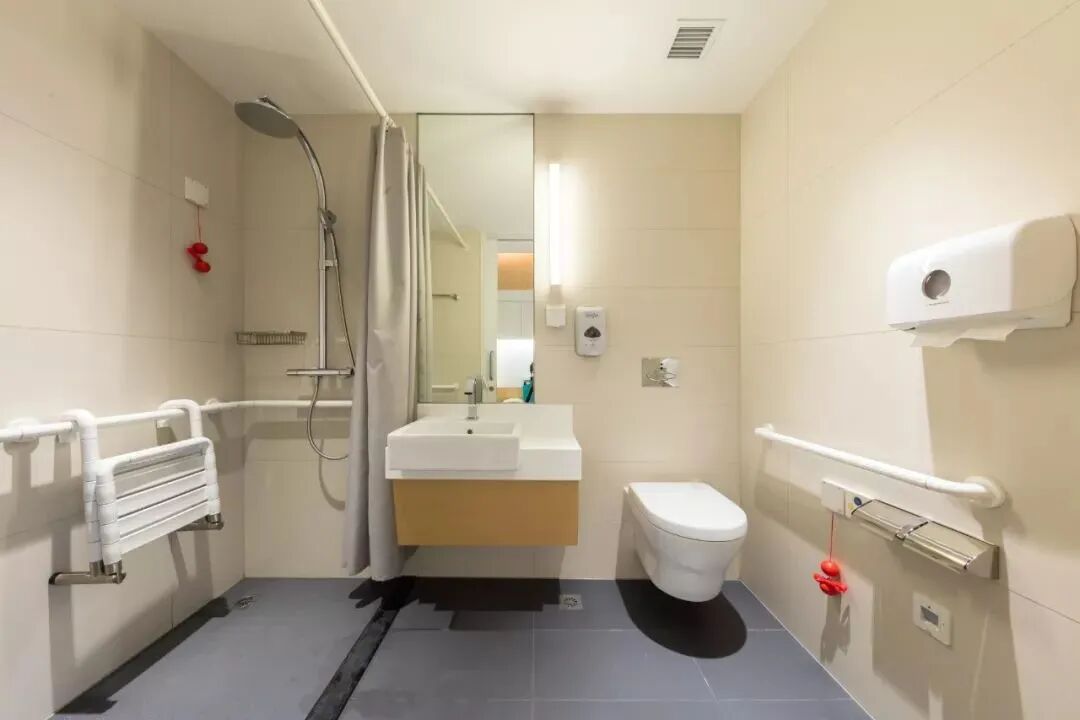 d、患者使用的卫生间内净宽应≥1000cm,淋浴区域短边宽度≥900cm,有条件的情况下应≥1500cm。