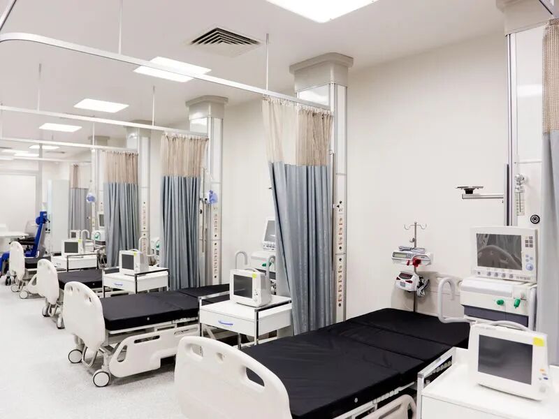 你一定在想,这玻璃门这么通透,那卧床的患者更换衣服或者使用便盆的时候岂不是很不方便。出于对患者私密性的考虑,在病房入口处设置了医用抗菌隔帘。