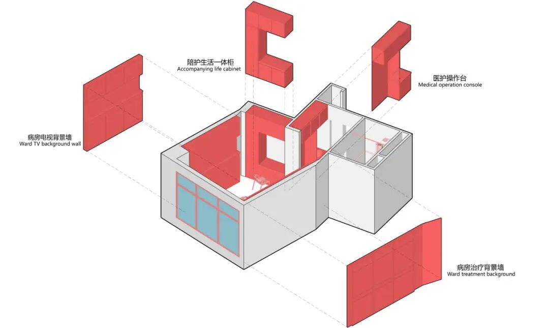 病房的功能主要从患者、患者家属、医护人员3个方面考虑,分为医护准备区、医护监护区、陪护生活区、家属陪护区、患者恢复区、卫生间(干/湿区)7个区域,面积约30m²,满足生活及治疗需求外,预留出了充足的活动空间。