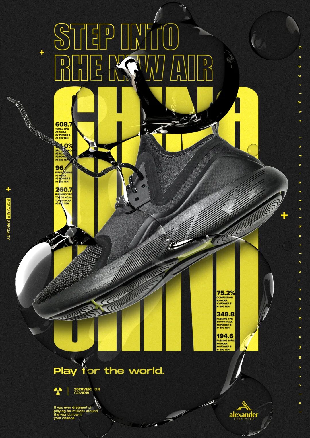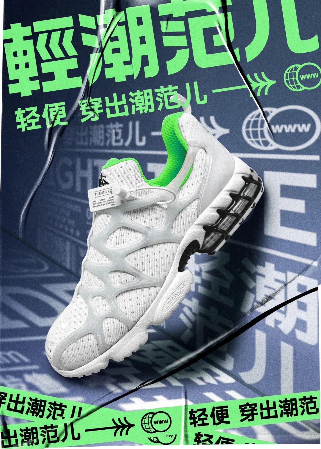 就拿运动鞋类海报来说,👉鞋子主体一定要放大,可以利用某些背景和产品的反差色,来突出主体,使产品更具有吸引力。