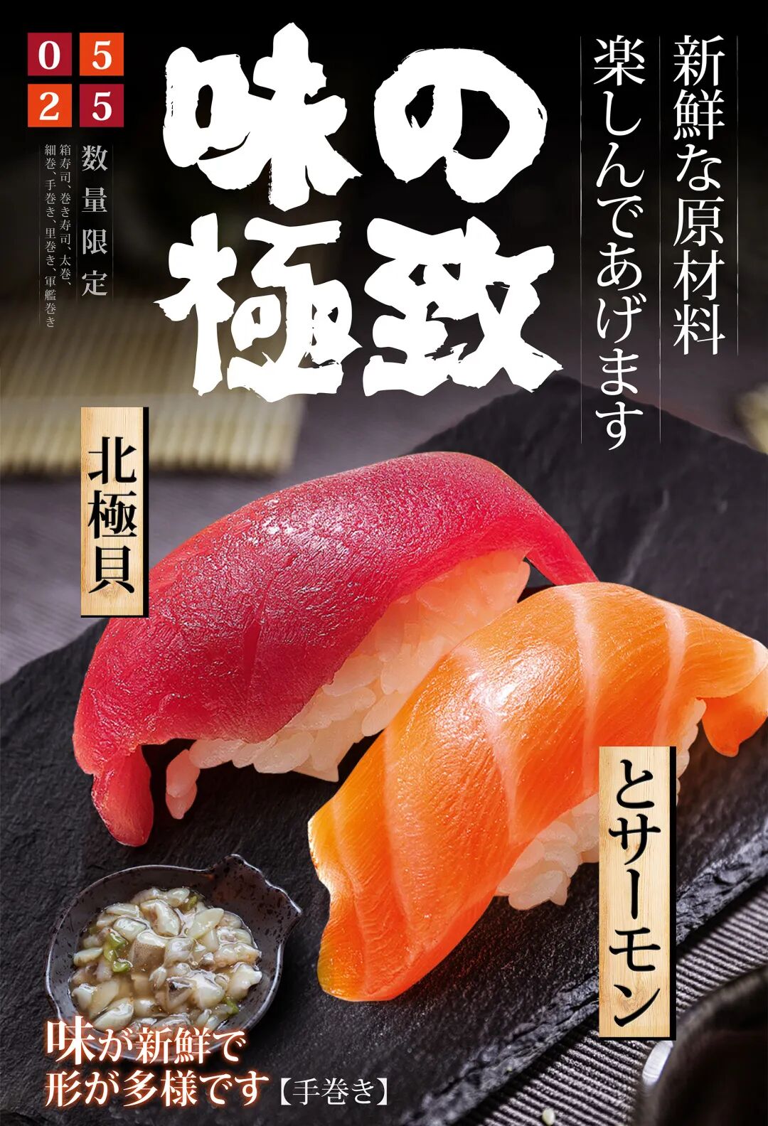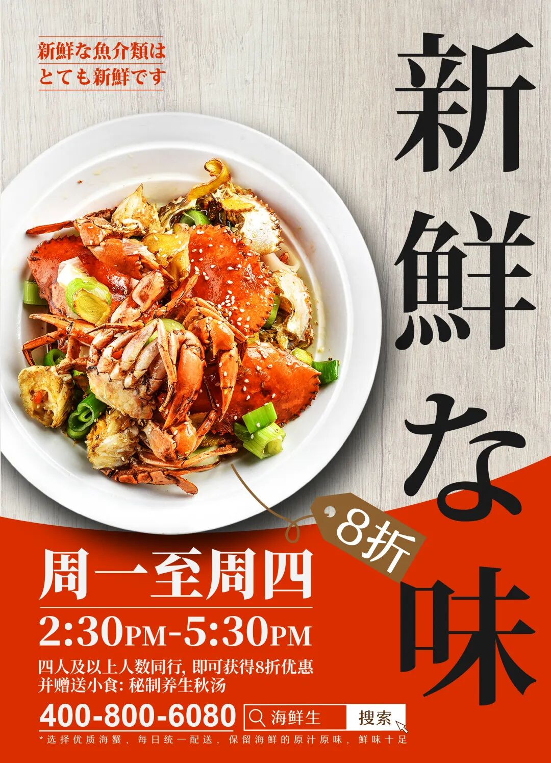 第二组海鲜美食海报,采用的是左右构图,将画面的重心放在左边,文字放在右边,具有平衡、稳定、互相呼应的特点。