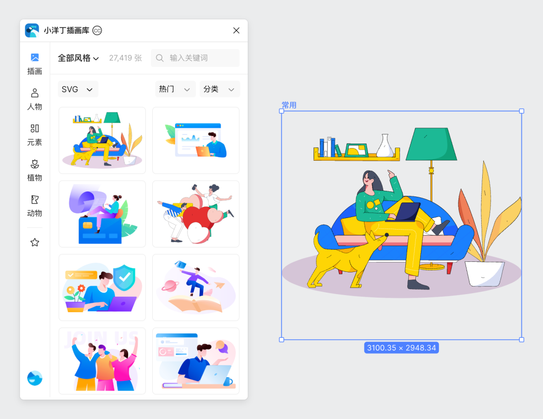 使用方法也非常简单,运行插件后,选择合适的插画,拖拽到画板内即可直接使用。