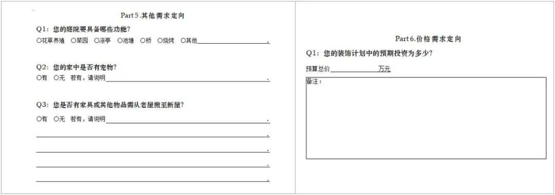 最好最高效的方式是把住宅客户的问题提前设想好,从基础需求,空间需求,功能需求,设备系统等;归纳成表格,提高沟通效率及沟通质量!