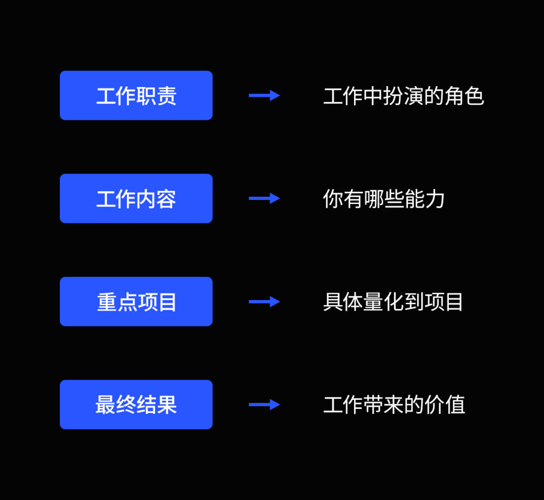 我个人认为,工作经历最好从以下几个方面来表述,即工作职责+工作内容+重点项目+最终结果。运用到实际种是这样的: