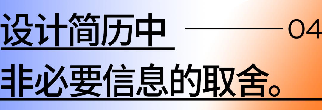 在设计中我们常说“少即是多”,越是复杂的设计,获取信息所需的时间和精力就会越多,越不利于信息的传达。对于个人简历同样如此。