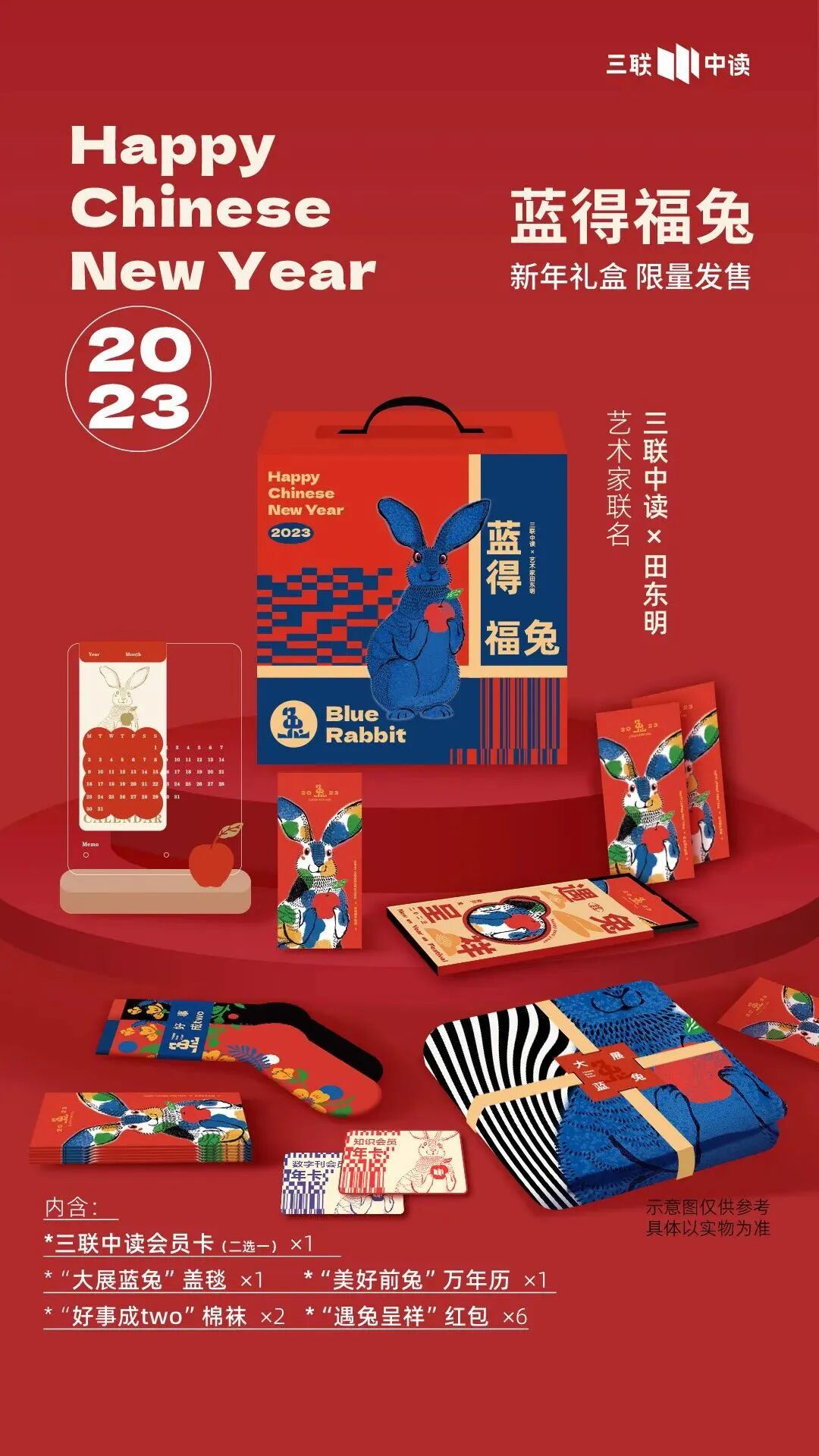 三联中读与艺术家田东明联名的“蓝得福兔”新年礼盒,文艺范儿十足,颠覆年礼红红火火的审美疲劳。礼盒中包含有“大展蓝兔”盖毯、“好事成TWO”棉袜、“遇兔呈祥”红包、“美好前兔”万年历,所有内容物的取名都极具美好祝福之意。