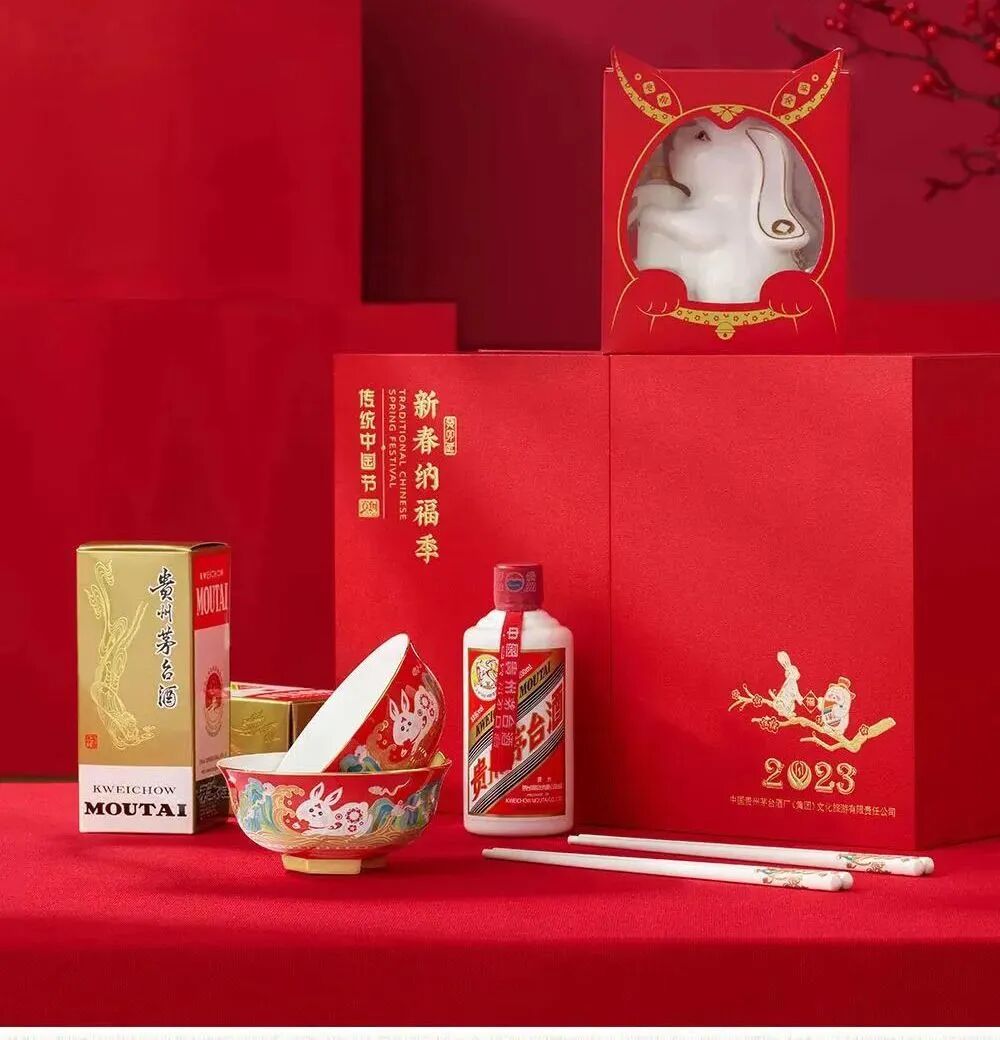 茅台2023年兔年的“传统中国节 新春纳福季”文创产品套盒,礼盒由玉兔、茅型瓶、中国结构成暗纹图案,将春节符号与茅台文化深度结合。礼盒包含飞天茅台、玉兔迎春碗餐具套组、兔报平安陶瓷摆件,子盒则有纳福春灯。整体上,这套文创产品颜值非常漂亮,适合作为2023年春节的伴手礼。