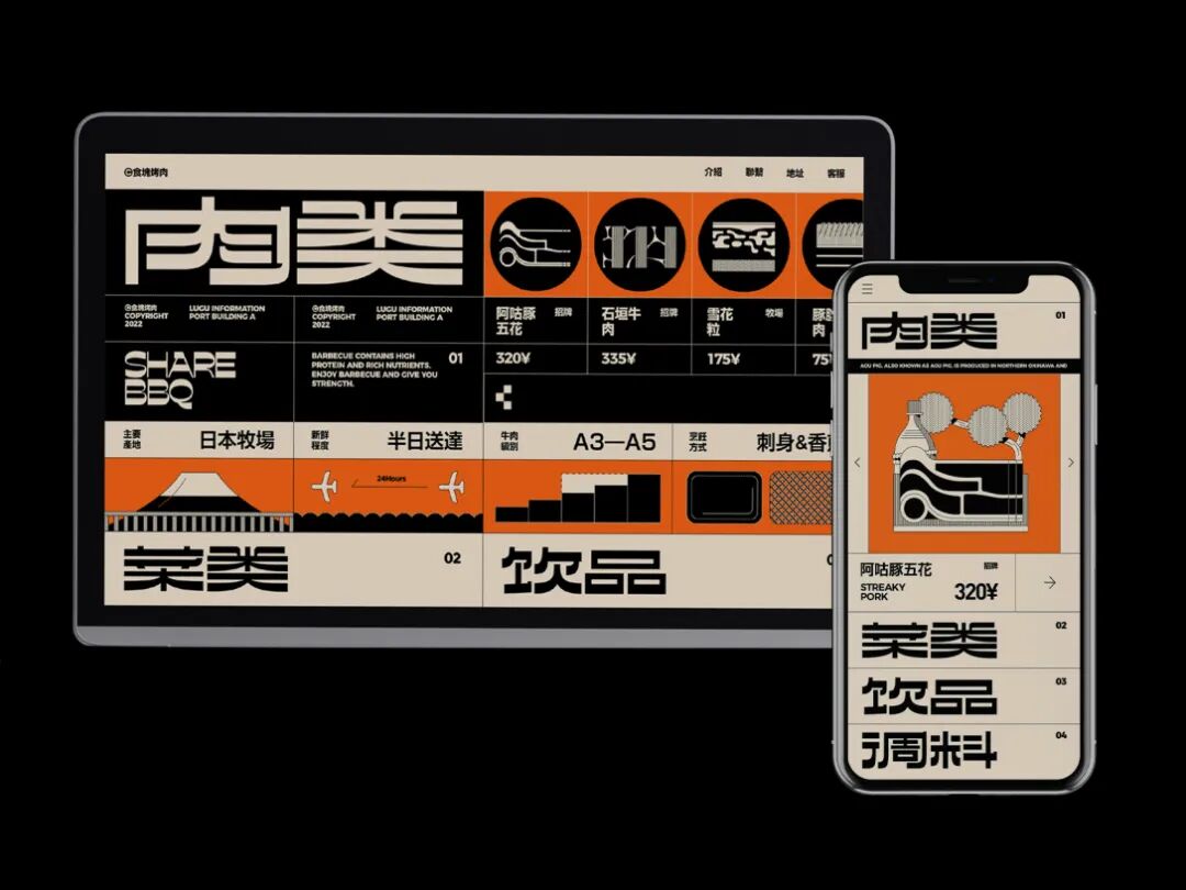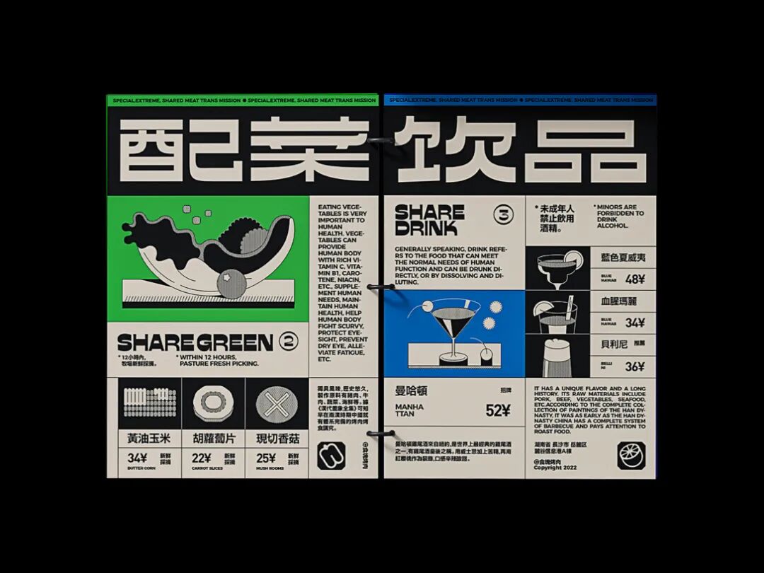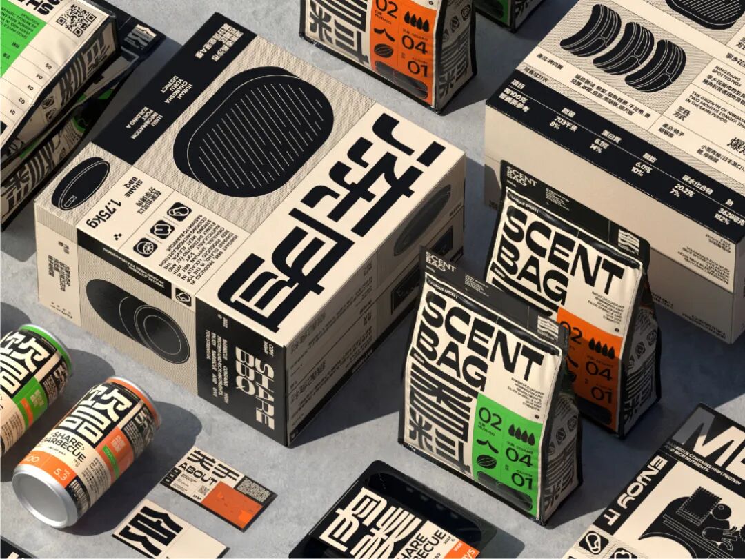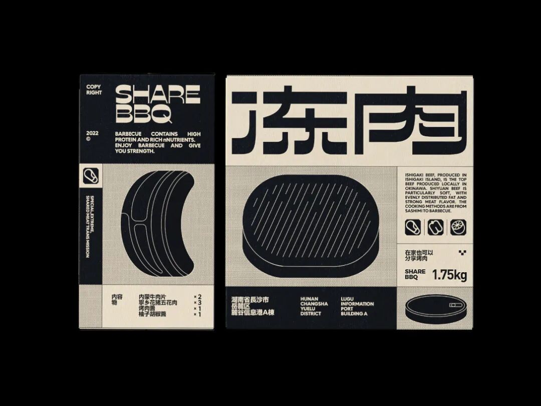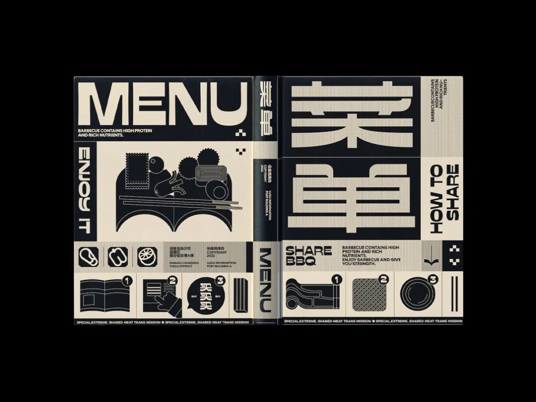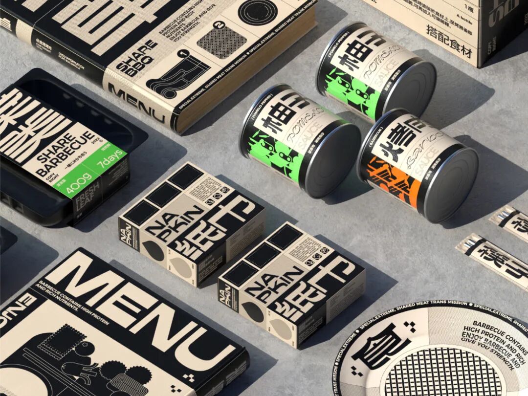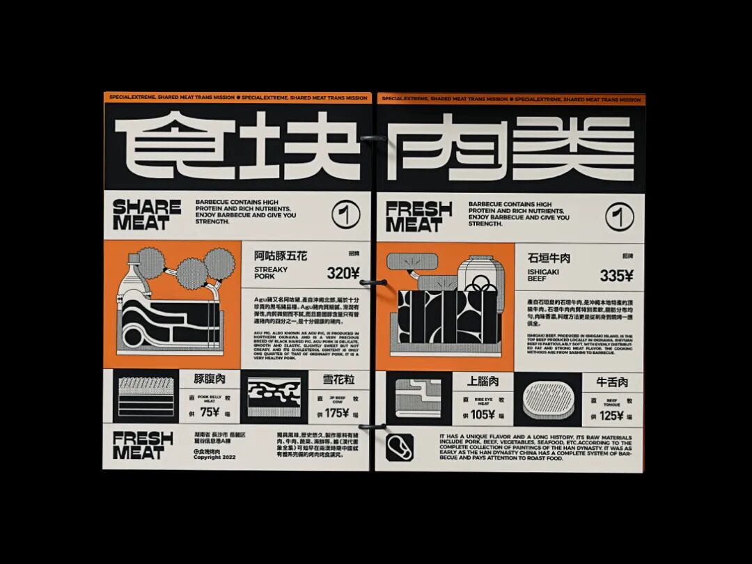 食块烤肉是一家创立于长沙的烤肉品牌。在设计上,我们从“现代复古”概念中出发,利用不同密度的网点带来不同灰度的效果进行突破。同时在配色上做了比较大胆的尝试——仿旧纸色+黑色+高饱和品类色。以及随着物料灵活拉伸的美术字、黑白图形搭建出特别的、统一的整体视觉。