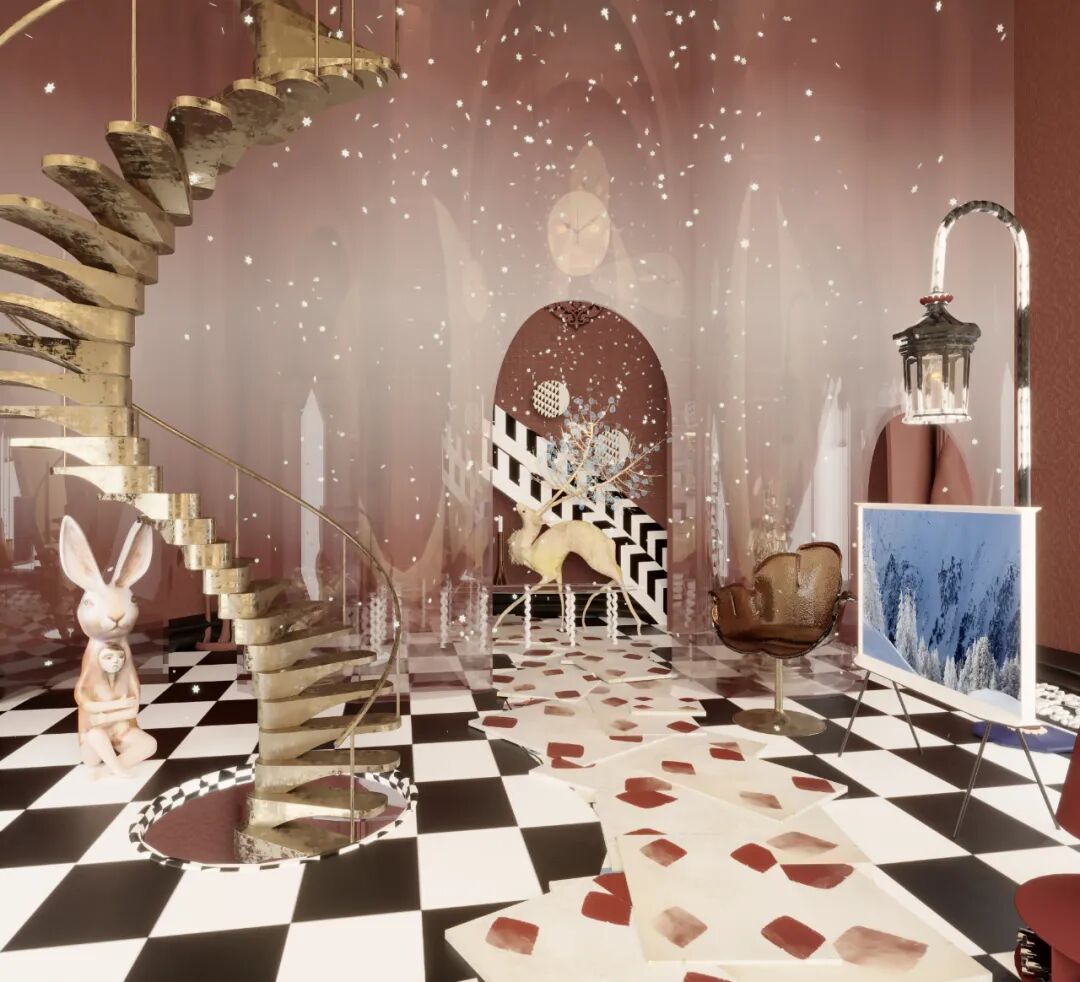 答:我以玛格里特曾经的作品作为灵感,设计了一个偏怪诞但又十分巧思的家居空间。设计思路来源于比利时超现实主义画家玛格里特1929年作品《虚假的镜子》。眼睛作为我们观察世界窗口,透过眼睛看到世界都是独一无二不可复制。由此来畅想玛格里特式的超现实主义住宅。