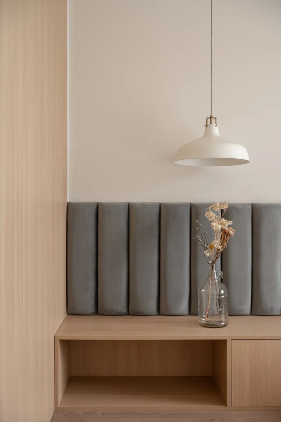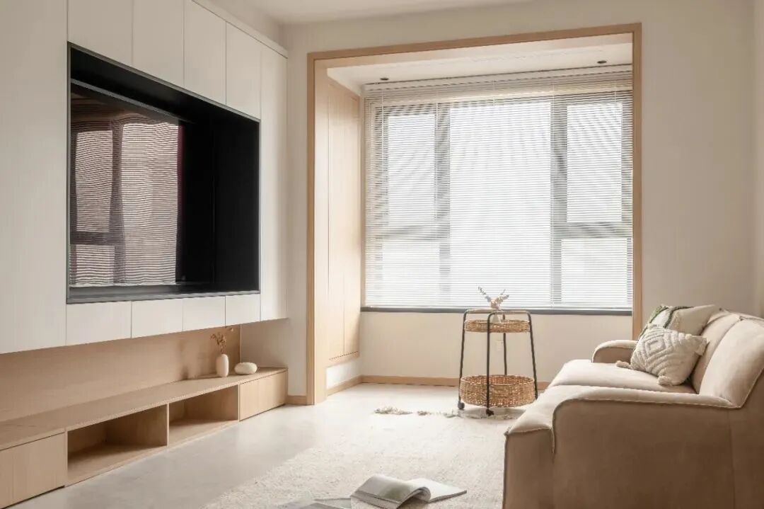 The living room is designed without the main light, the light source uses the linear atmosphere light and the TV background wall to do the overall customization, which is visually more beautiful and neat, and has the powerful storage function. The wall on the right side of the sofa is decorated with art glass bricks, and every detail is carefully created to create a relaxing rest space.