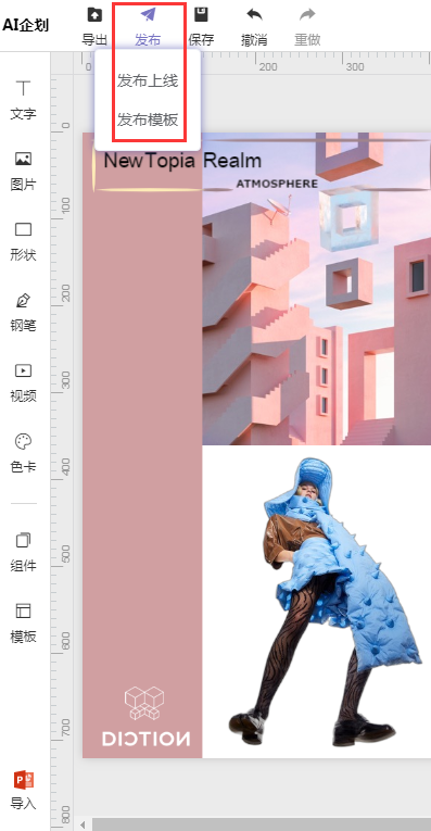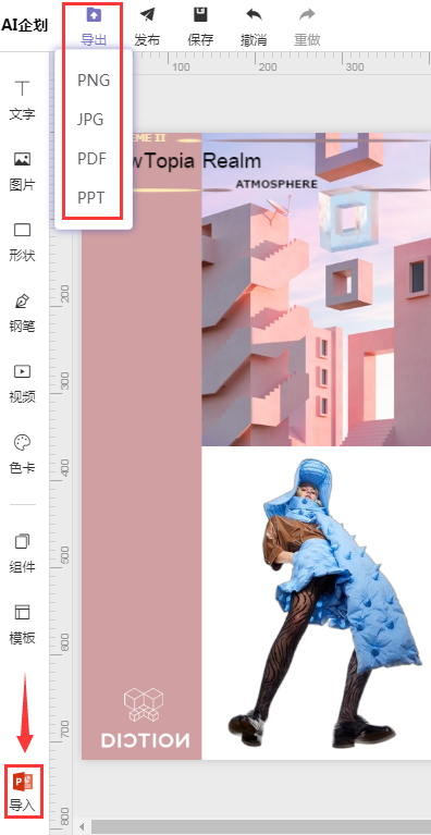 导出:可以把已经设计好的企划项目导出成 JPG、PNG、PDF、PPT 格式保存到电脑中