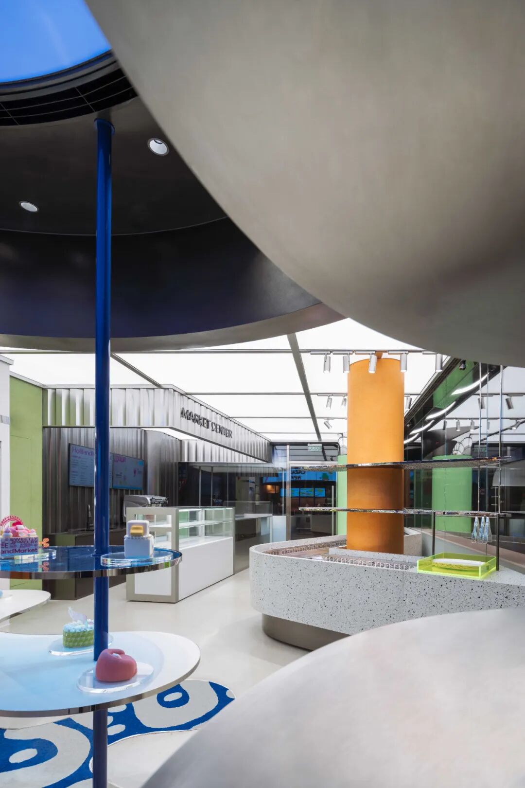 在Holiland Market的设计中,SLT利用自然界基础的三种形态——“圆”、“方”、“三角”,对内外空间进行形态构思和统领划分。作为造型结构中精髓元素的归纳,这三种简洁的几何造型传递出不同的情感线索和视觉印象:“圆”象征交流、沟通;“方”代表传统;而“三角”代表潮流。三种建筑体块的相互配合、交融、形变,既是对蛋糕造型的视觉呼应,也是对“集市”多元文化内涵的映射。Holiland烘焙的创意灵感与集市生活的人文体验在视觉上交叠在了一起。