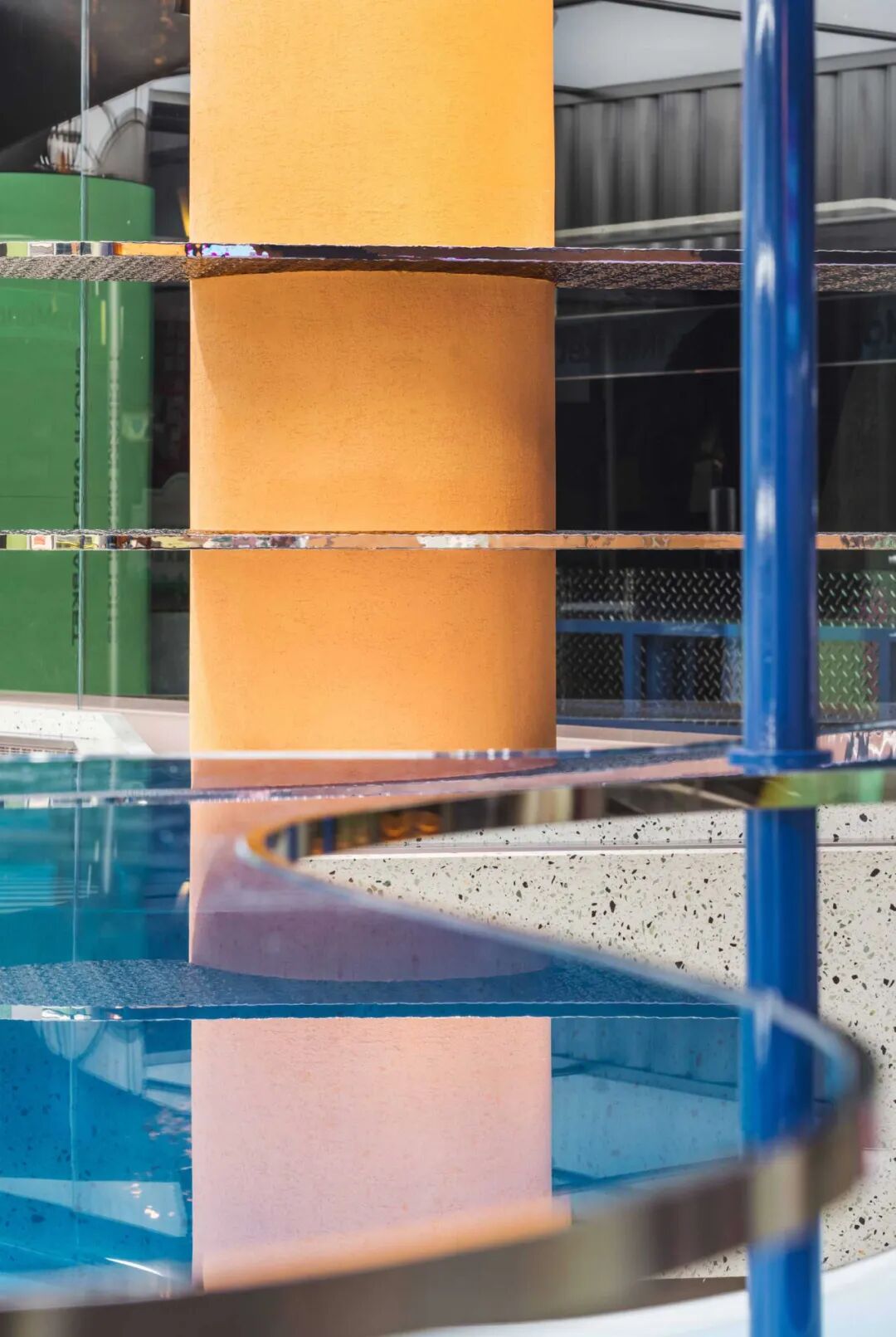 室内的墙面采用了水磨石、肌理漆等材质,色彩的运用上延续了活力橙与青草绿,传递出青春自然的氛围。嵌入式柜台金属板的创造性运用和天花上的动态旋转屏幕,在制造视觉冲突效果的同时,为空间带来一丝动感。