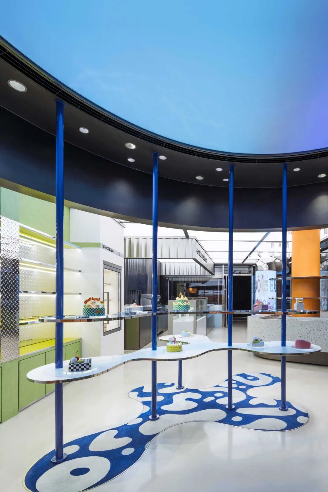 从大门径直进入,映入眼球的蛋糕展示区是由SLT精心打造的不规则的弧形展台。弧形由基础形态“圆”通过无线变幻得来,而“圆”作为一个极具包容感的象征图形,暗示着弧形展示台在任意方向上的观赏性。空间的体验面向变得多边化。同时,作为一个视觉中心,垂直方向上三种不同材质构成的弧形元素,彼此交错,在有限的室内环境里制造出观看体验的呼吸感。