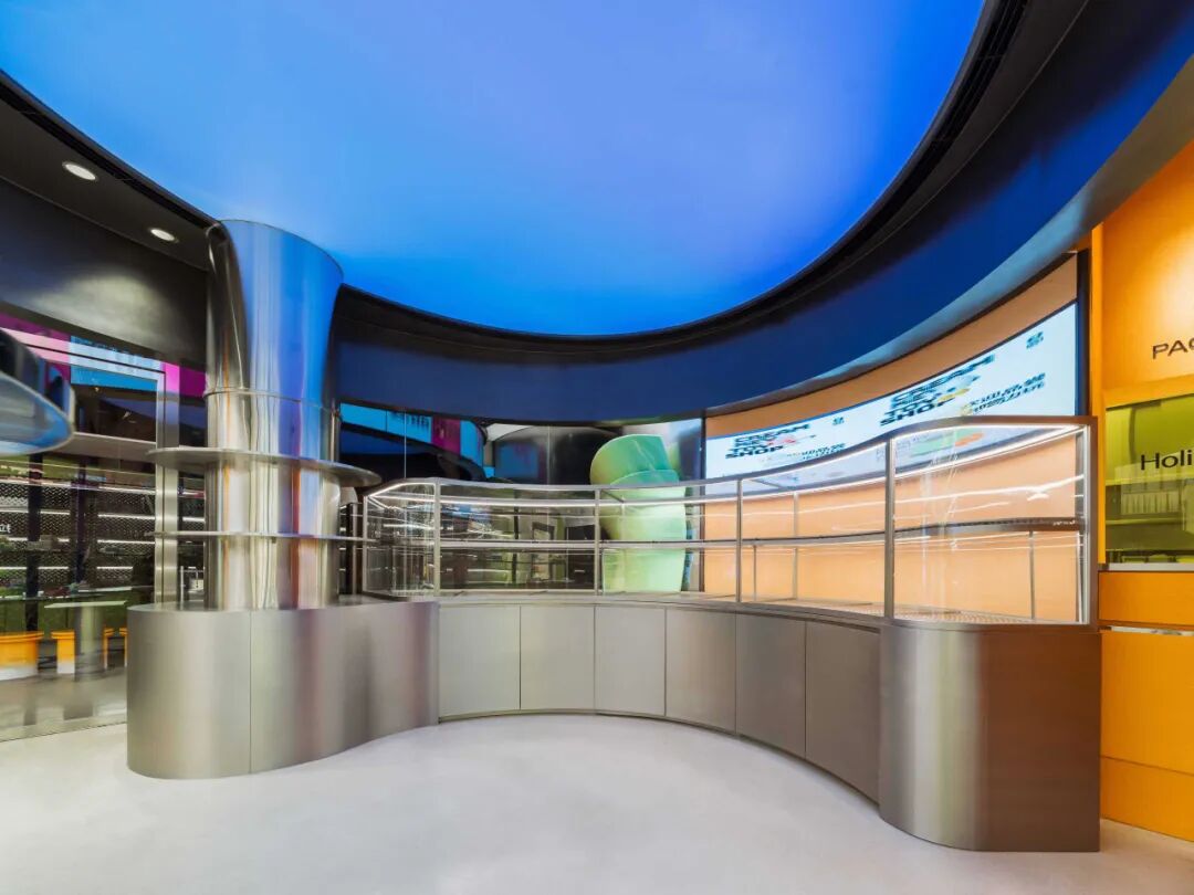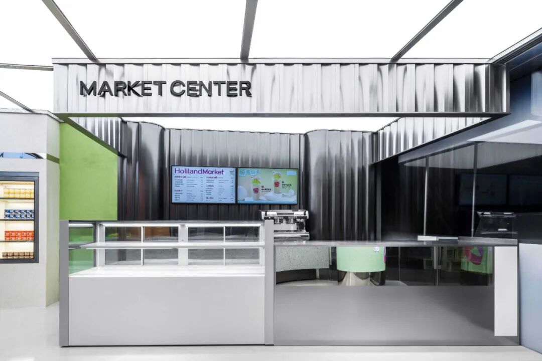 Holiland Market的外摆区域既是对露天集市摊位的还原,也是室内空间的延伸。作为过路行人的First Sight,由三种基础形态对应生成的三个不同的主题“摊位”通过极具潮流感的活力色彩夺人眼球。而摊位造型上的差异从社交属性的心理学特点上,暗示了人群的不同聚合模式。不锈钢烤漆材质的方形座椅模块为非固定的场所道具,在保证耐用性的前提下,可以根据顾客数量、就餐规律、餐位密度适应不同的就餐形式,体现集市灵活性、流动性、适应性的特点。