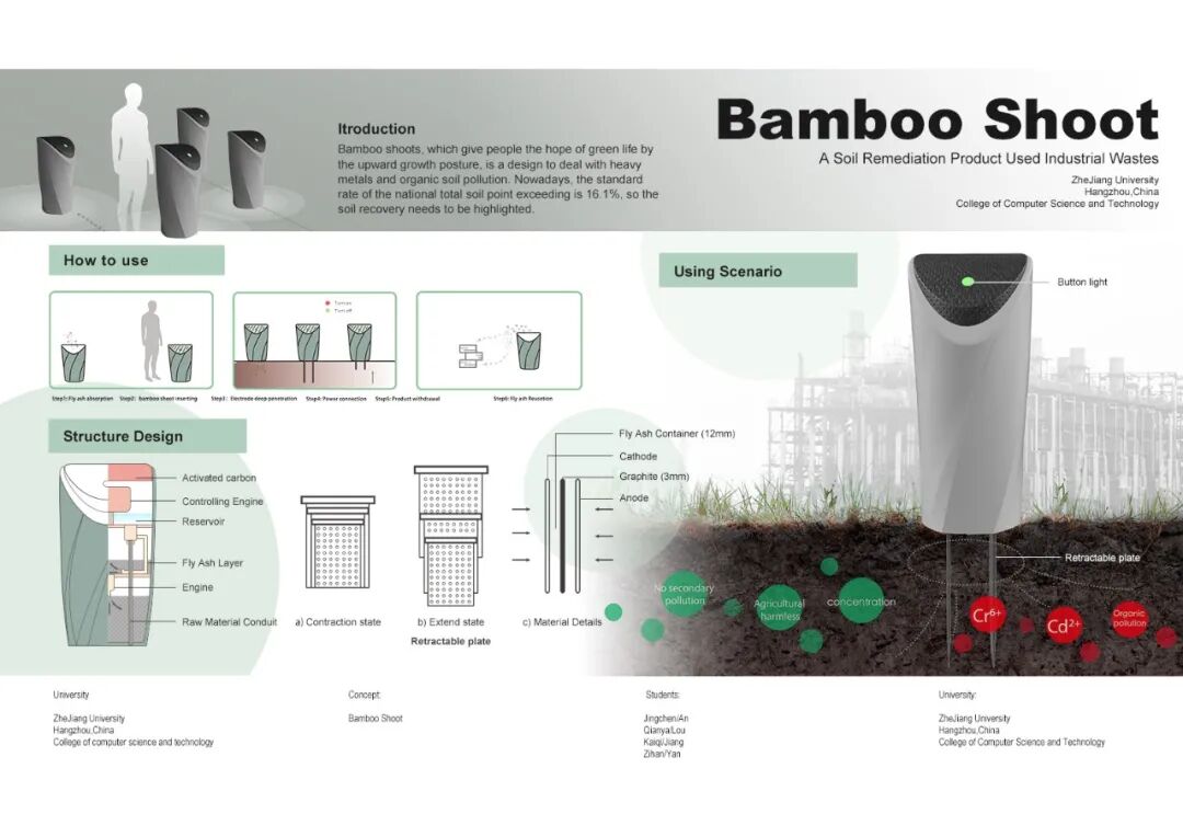 Bamboo Shoot旨在消除重金属和有机土壤的污染,传达土壤恢复的希望。依靠EK-PRB(电动力学耦合渗透性反应墙)和EK-Fenton技术的结合,该设计实现了土壤重金属和有机物的双向处理,效率高且去除率高。该产品使用粉煤灰、工业废料和空气中的水蒸气。