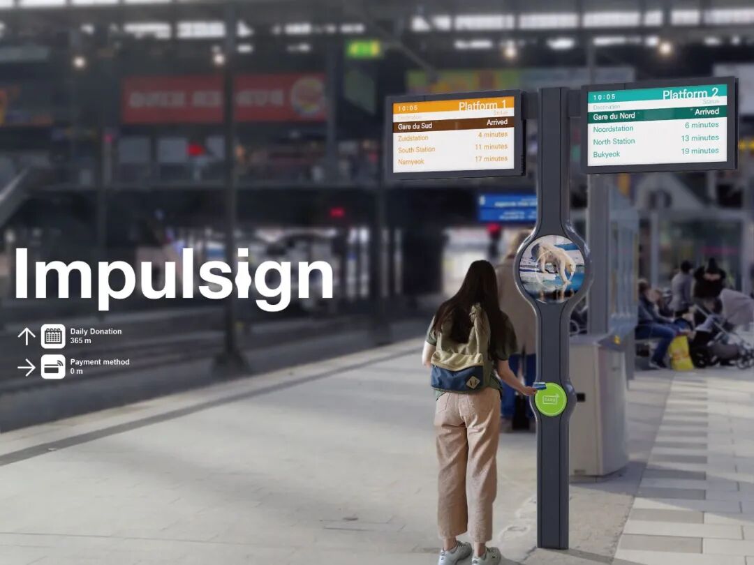 Impulsign旨在帮助慈善机构和NGO募集资金,它结合了标牌、透明的OLED屏幕和读卡器,使非政府组织可以向路人展示社交媒体风格的短片(“故事”),从而鼓励人们“冲动捐赠”。Impulsign遵循历史悠久的铁路时钟设计隐喻,现在也可以代表“气候危机时钟”。每张卡的捐赠记录都会保存下来,每笔捐赠都会将捐赠者的气候危机时钟设置为1秒钟,作为个人的里程碑,从而激励他们在上下班途中更频繁地捐赠。