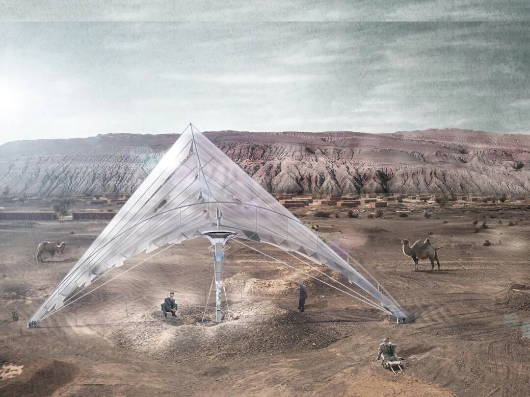 此解决方案旨在解决灌溉暗渠(kariz)干涸的问题,解决方案在中国新疆省吐鲁番盆地施行,利用吐鲁番地区日夜温差大的优势,利用MOF的材料和风力来凝结水并将其供应给灌溉暗渠。设备顶部有一个可折叠的地下水补充器,可确保从空气中收集水。
