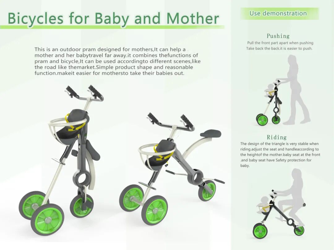 这种产品设计结合了婴儿推车和自行车,允许新手妈妈带孩子在公园里兜风,然后在城市的街道和集市上舒适地漫步。这款二合一产品可让母亲进行有氧运动(许多人很难找时间做),同时还能满足宝宝对亲密和刺激的需求。
