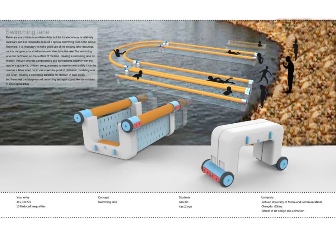 在世界许多地方,社区负担不起建造游泳池的费用。此设计将模块化部件放入湖中,打造封闭的安全泳道。顶部的浮管设计令泳道可稳定漂浮,提供了一个安全的空间,儿童可以在此学习游泳。从水中取出后,这些装置还可以作为桌子。