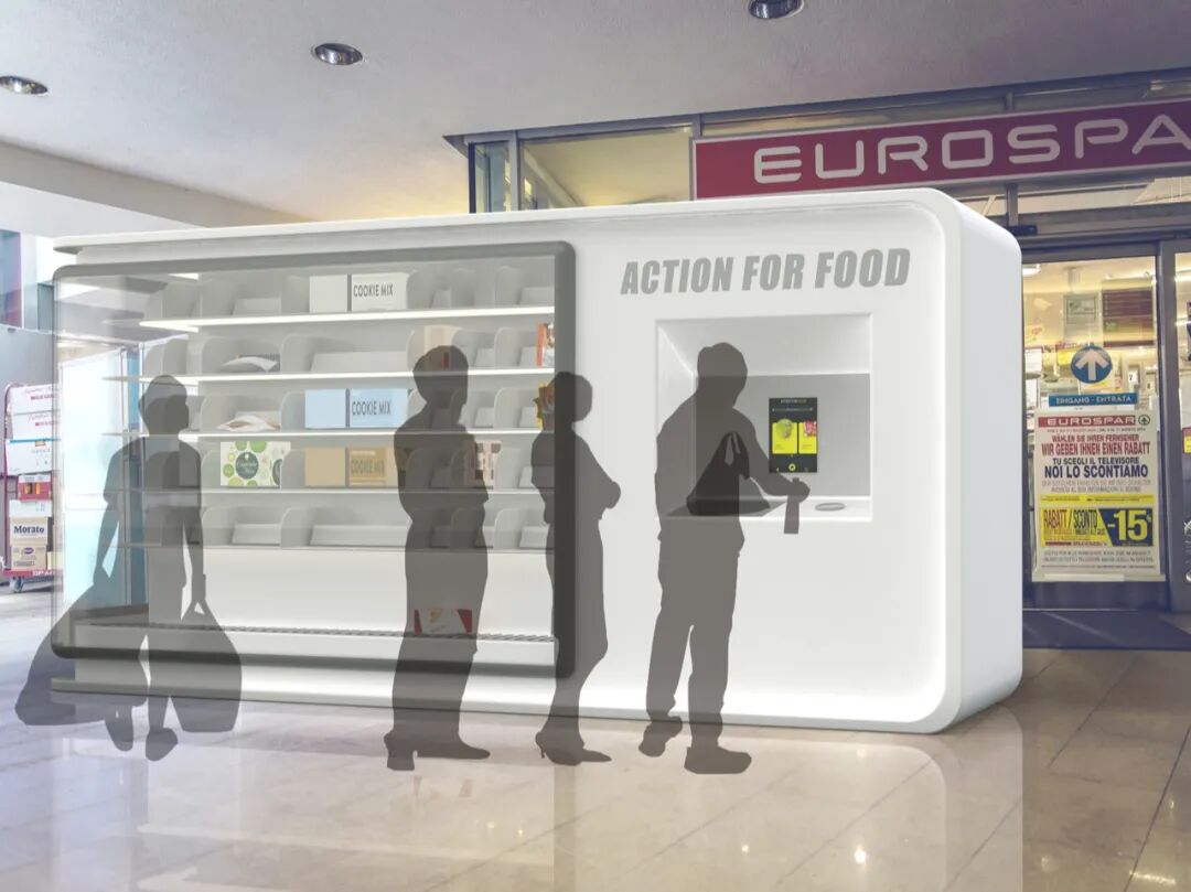 “ACTION FOR FOOD”自动售货机既对环境又对社会负责。它让用户收集一次性塑料瓶,并用它们交换接近有效期限的食物。通过这种方式可以立即改善几个问题:废弃的塑料垃圾、食品浪费以及无家可归者或其他社会边缘人的饥饿。