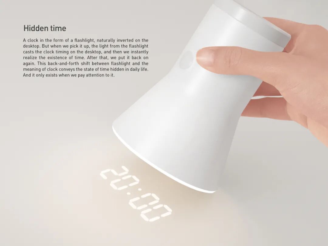 评委点评:这个类似手电筒的时钟刺激我们更深入思考时间的概念。在举起灯来显示当前时间的那一刻,用户进入了与时间概念和现实有关的有趣互动。因为只有在提起设备时才能看到时间,所以也有助于打破“看钟”的习惯。
