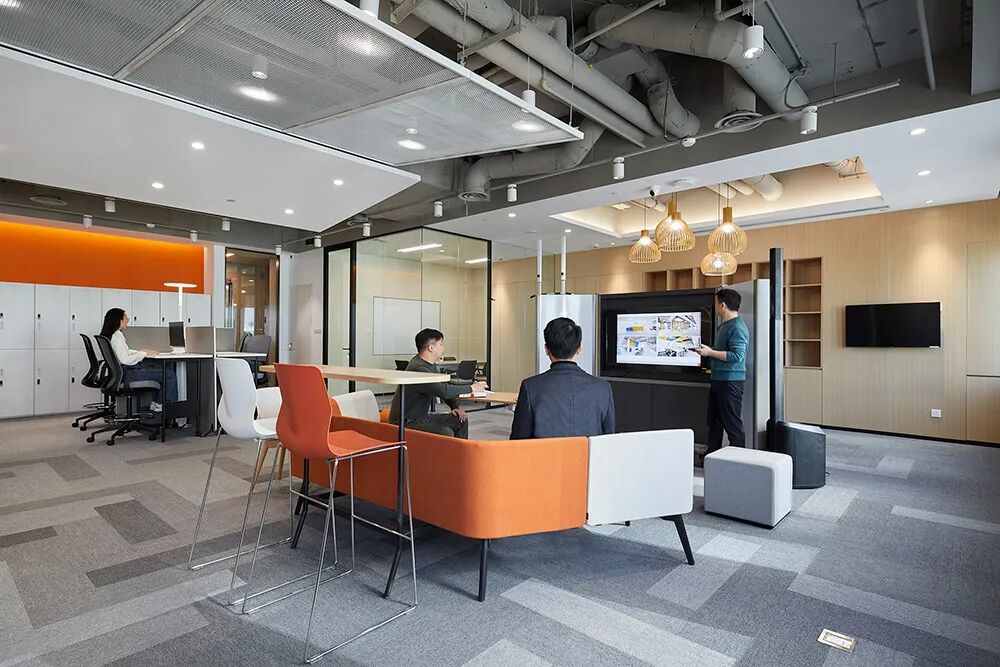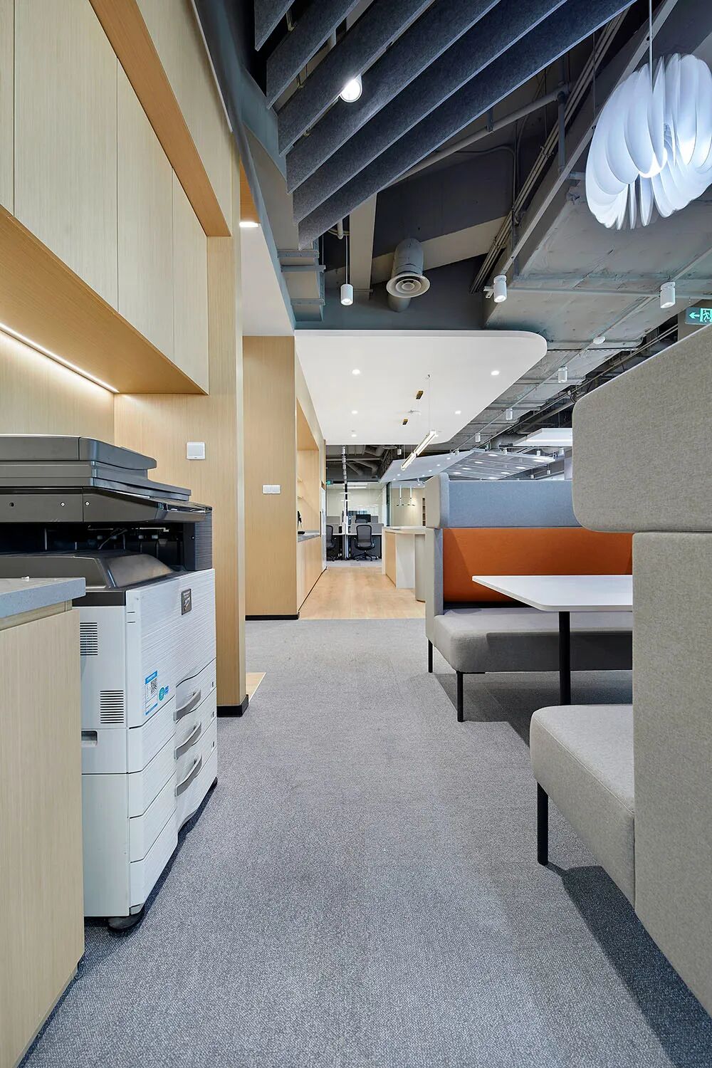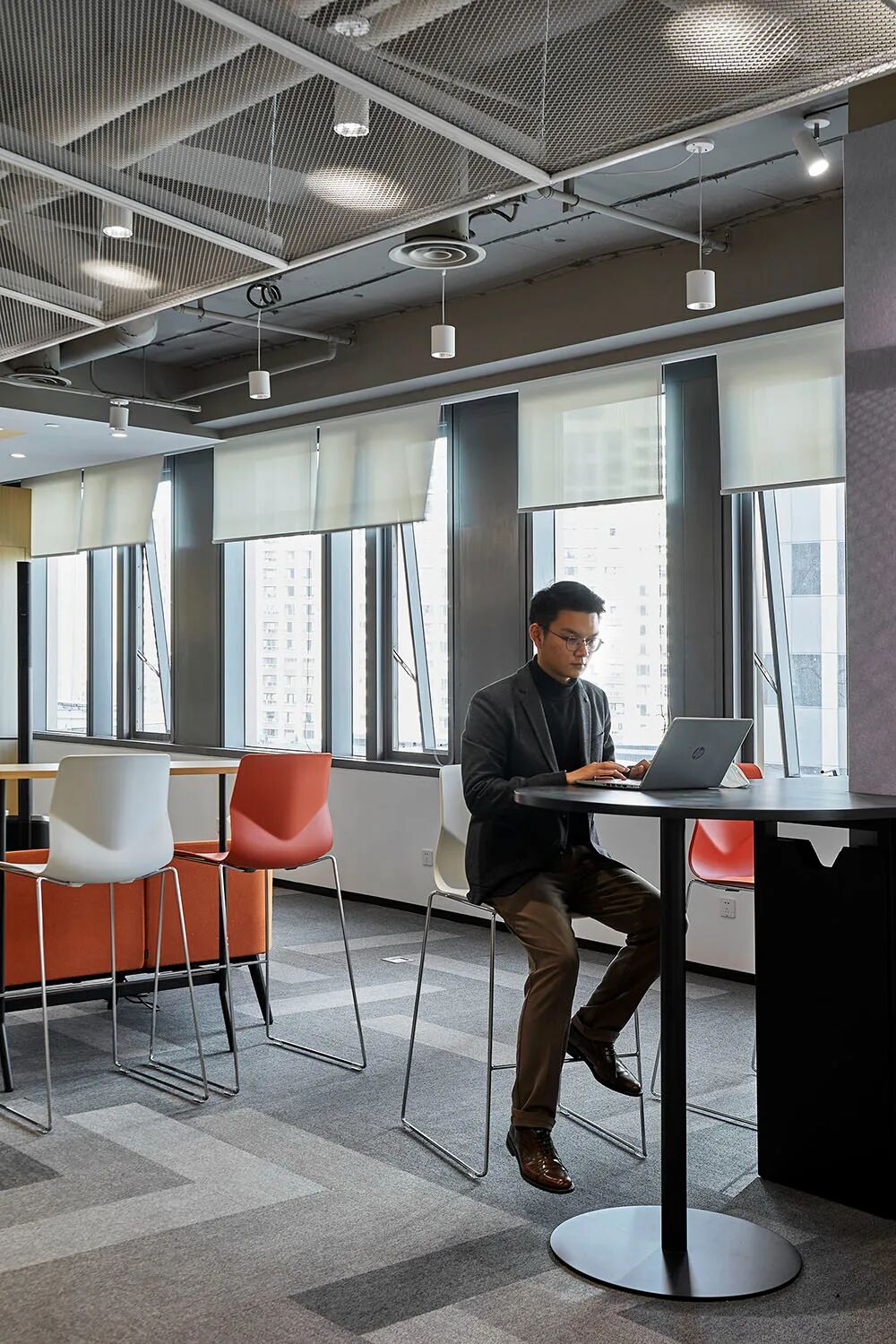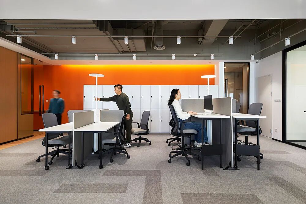 整体空间以浅色为背景,加以活力的康稳橙和沉稳的不同色度的灰色、木色,这组愉悦的色彩搭配在白色的调和下塑造出一个开放协作、灵动多元的办公环境。人性化和灵动而自由的模块化办公家具组合既满足个人专注工作、也能随时展开团队协作。可调节的工作台、人体工学办公椅、柔软的沙发和桌子,丰富了动态坐姿和自由选择,也让工作变得积极而有趣。
