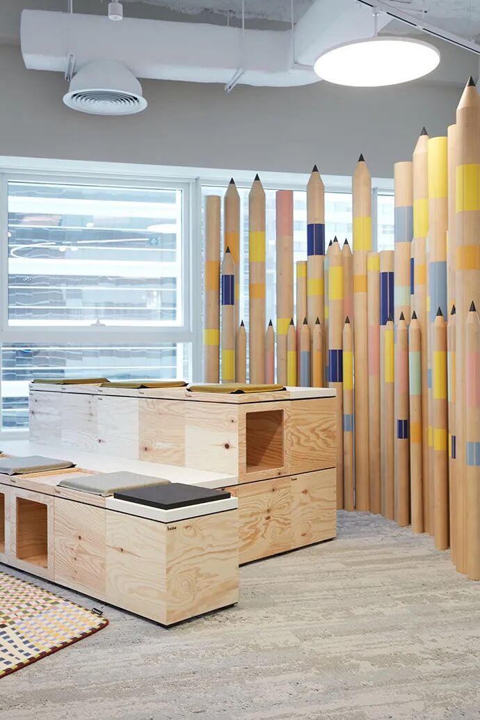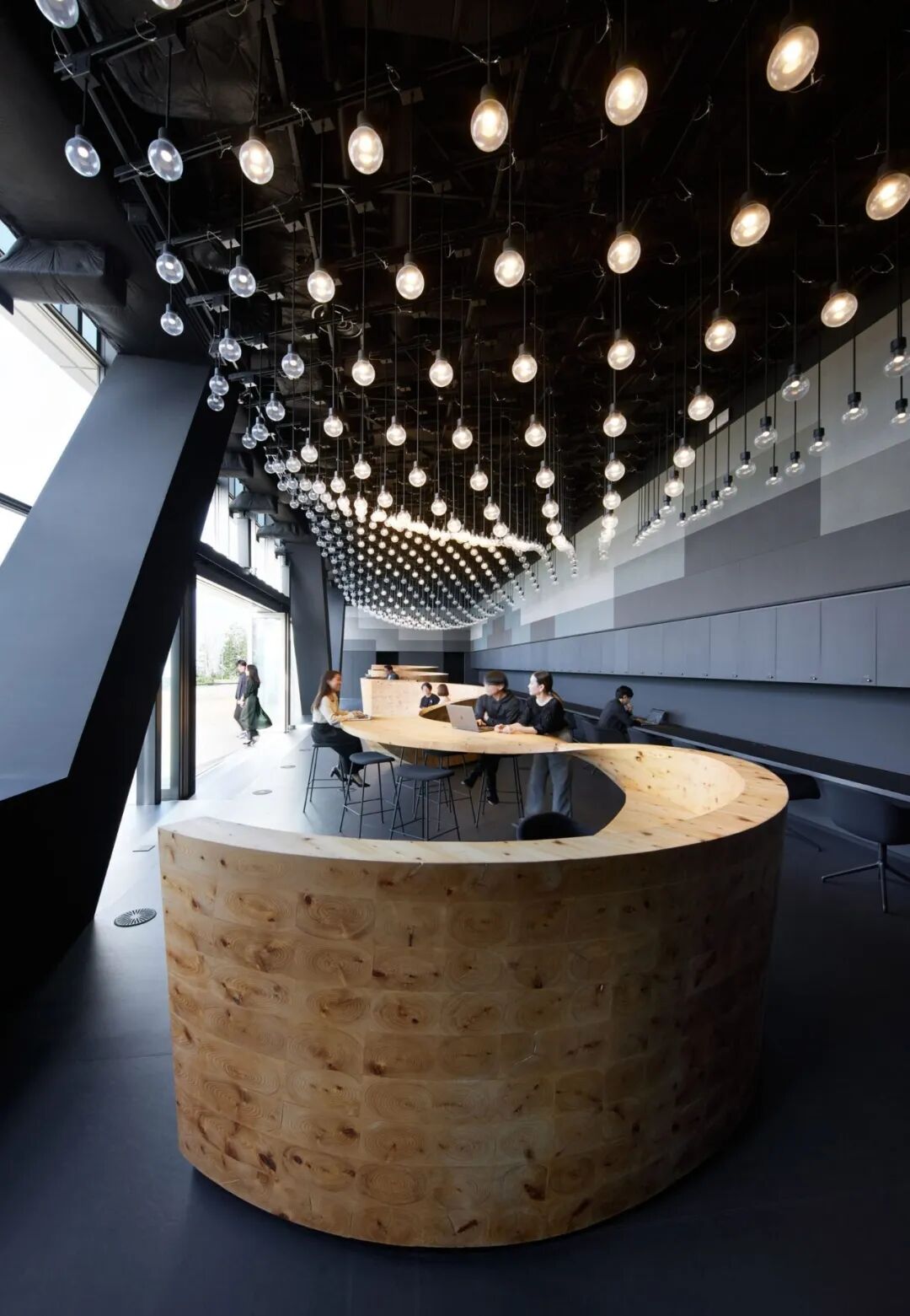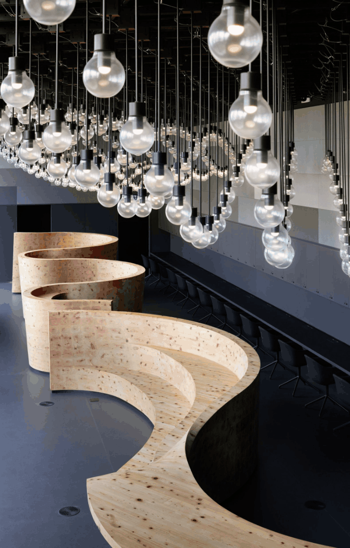 木质丝带采用日本雪松制成,这种材料的选择可为房间营造出自然的香气。除此之外,空间的布置非常简单,只有一些其他家具元素。座椅与地板的深色色调相匹配,而 534 个悬挂的灯泡则为天花板勾勒了地形图。由油毡和声学纺织墙板创造了富士山的抽象形象,作为像素化的空间背景。