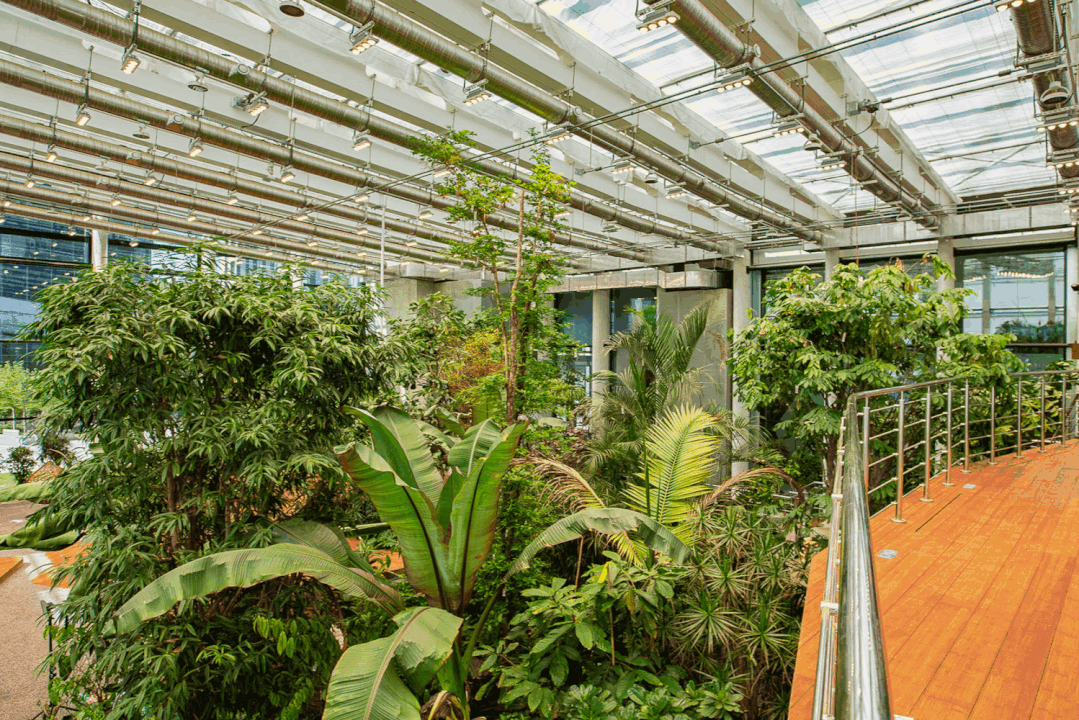 项目的目标是建造一个供使用者全时段和全季节使用的花园。气候控制方案确保夏季和冬季的温度维持在22°C到25°C之间。花园的气候条件由一台电脑管理的气候控制系统运行,该系统包括许多设备:带通风系统的供暖或制冷装置、雾化装置、人工光源、带养分回收溶液的植物灌溉和施肥系统、遮阳窗帘和打开侧窗的装置等。在这里工作的人们可以欣赏异域景观,且不会感到在热带的不适。
