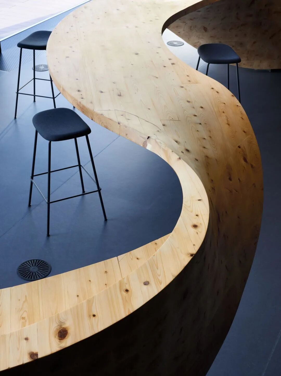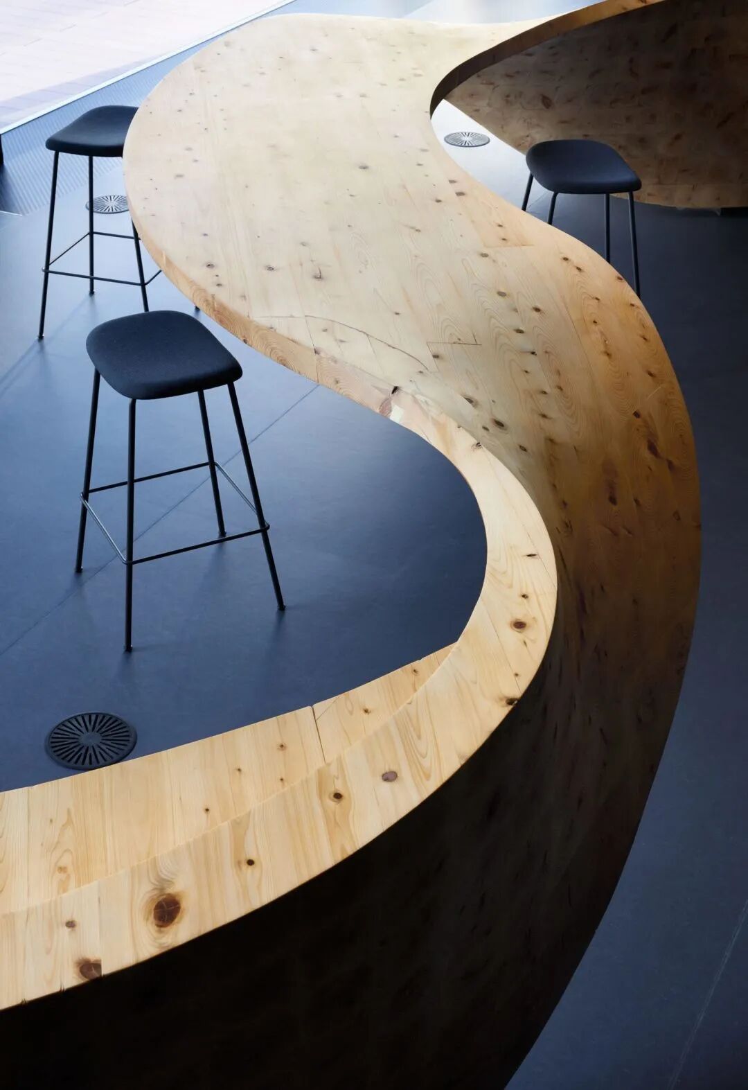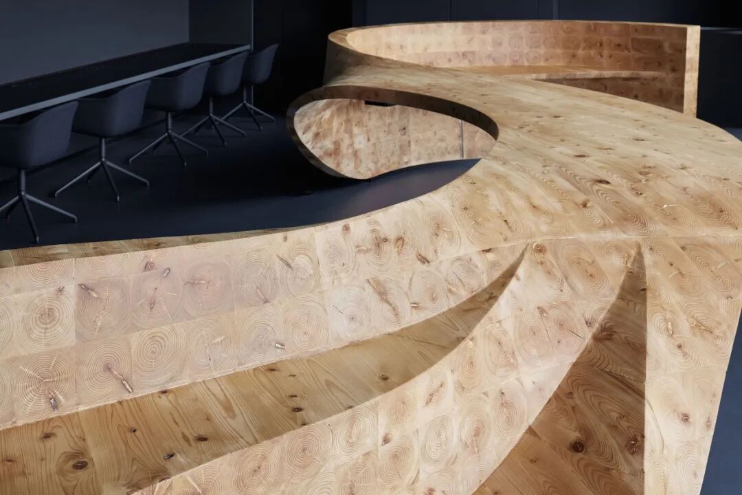 设计师用一组丝带般“超级家具”填充空间,而不是添加单独的办公桌椅。两个大型木制物体蜿蜒穿过整个空间,结合了座位区和桌面多种功能,可以同时供多人使用。包括接待处、圆形剧场、电话亭、会议空间和个人工作空间。