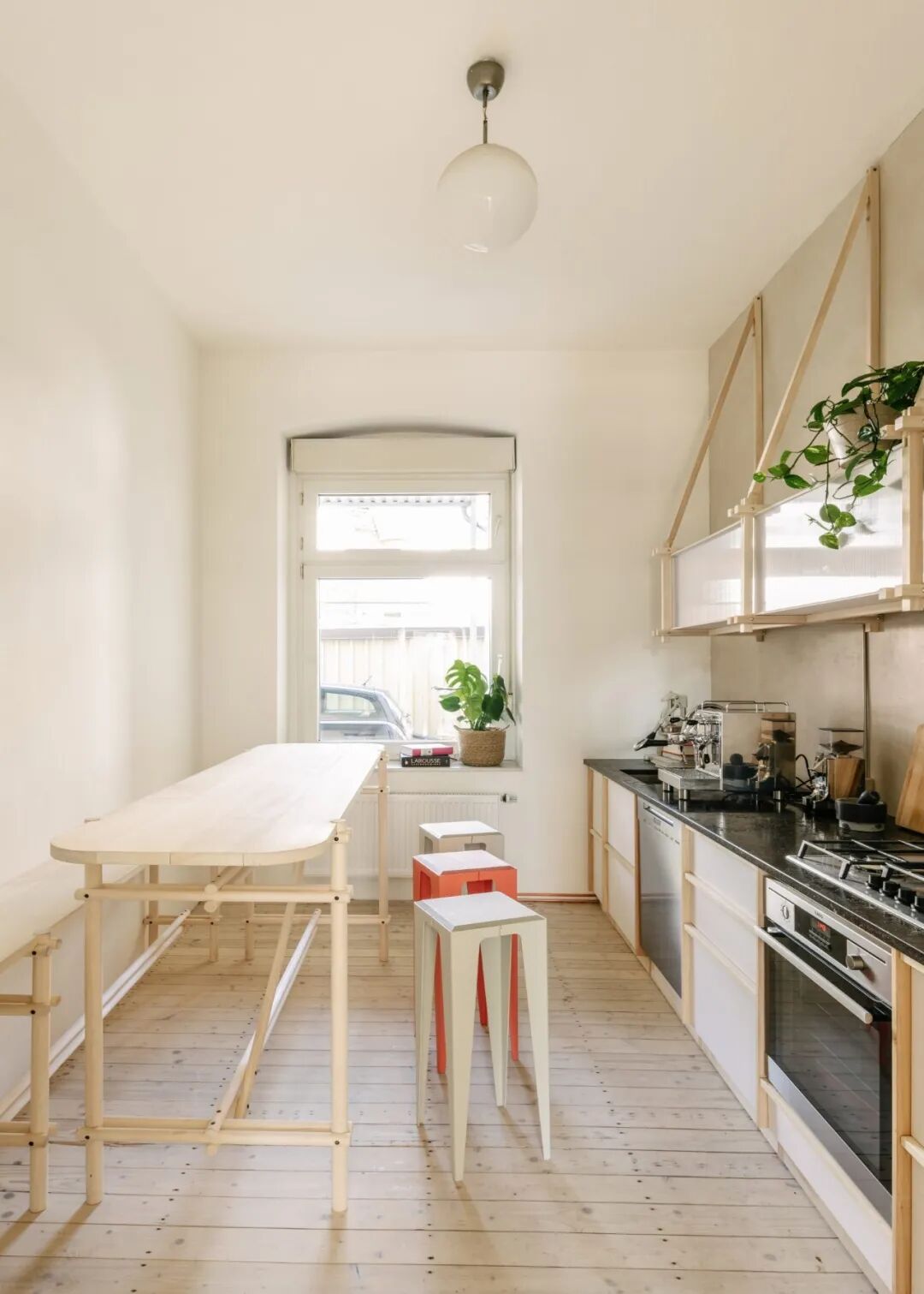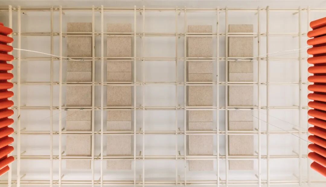办公室主要包括工作区、厨房和会议室,室内设计的材料和色彩中性而简约,其中还包括精心布置的盆栽植物和书籍。天花板采用废弃杨木进行无胶水组装;二手灯饰包裹在 Hey-Sign 轻盈的橙色毛毡中,为原本沙色的氛围增添了一抹色彩;还有在翻新过程中回收的现有木地板和水磨石地板,以及从资源节约型建筑材料平台 Concular 获得的加热器。