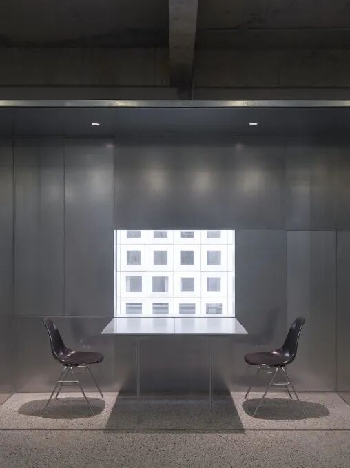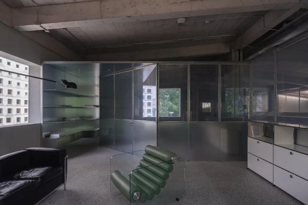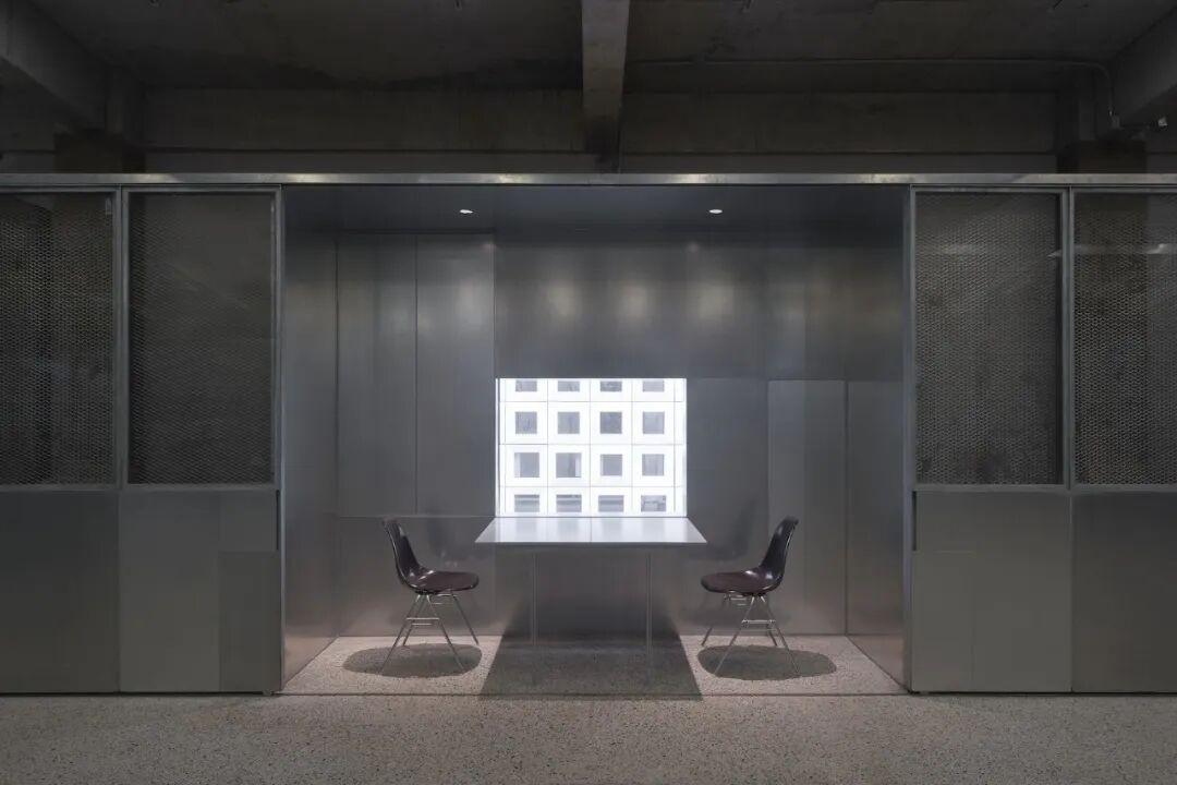 空间的设计使其可以提供多种功能,并创建了多个滑动门以提供灵活性,允许公司根据未来的需要改变工作空间。整个空间广泛使用不锈钢和磨砂玻璃,与混凝土结构形成对比,以此反映其不断变化的用途。