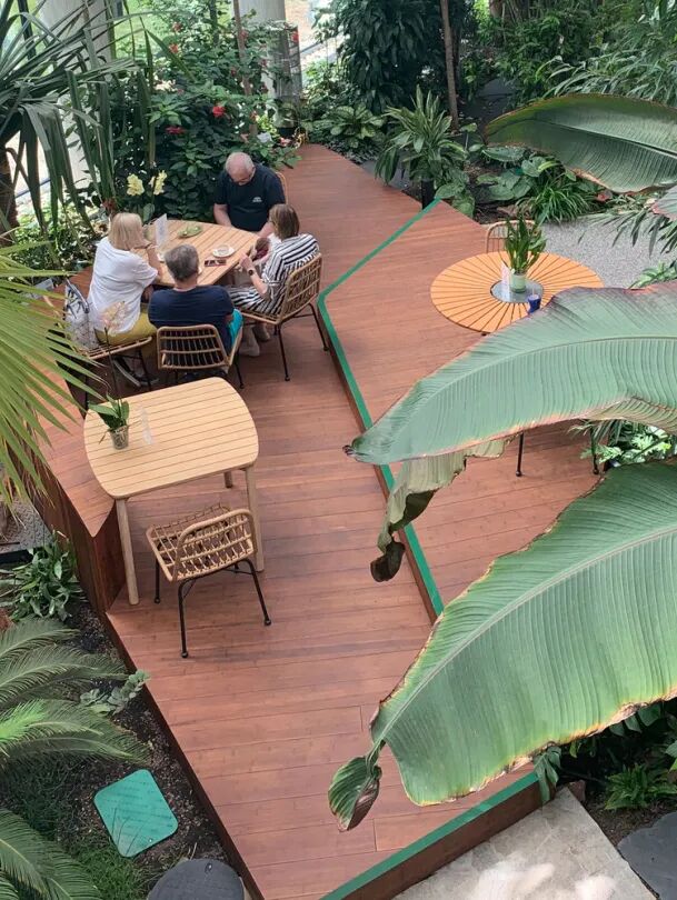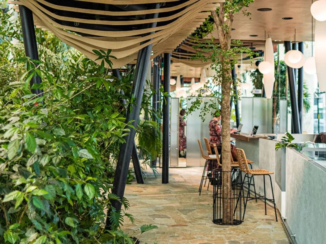 设计考虑了最重要的细节,例如噪音程度、空气质量、光线类型和环境。生机勃勃且丰富的热带雨林生态系统经过精心布置——花园中有来自印度尼西亚、澳大利亚、新几内亚、马达加斯加、委内瑞拉和热带亚马逊森林的植物。空间内设置了四个区域:对话、放松、共享办公和饮食区域,在它们之间穿插着夹层、露台、小径和坡道。