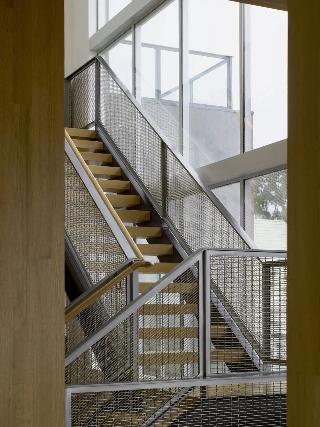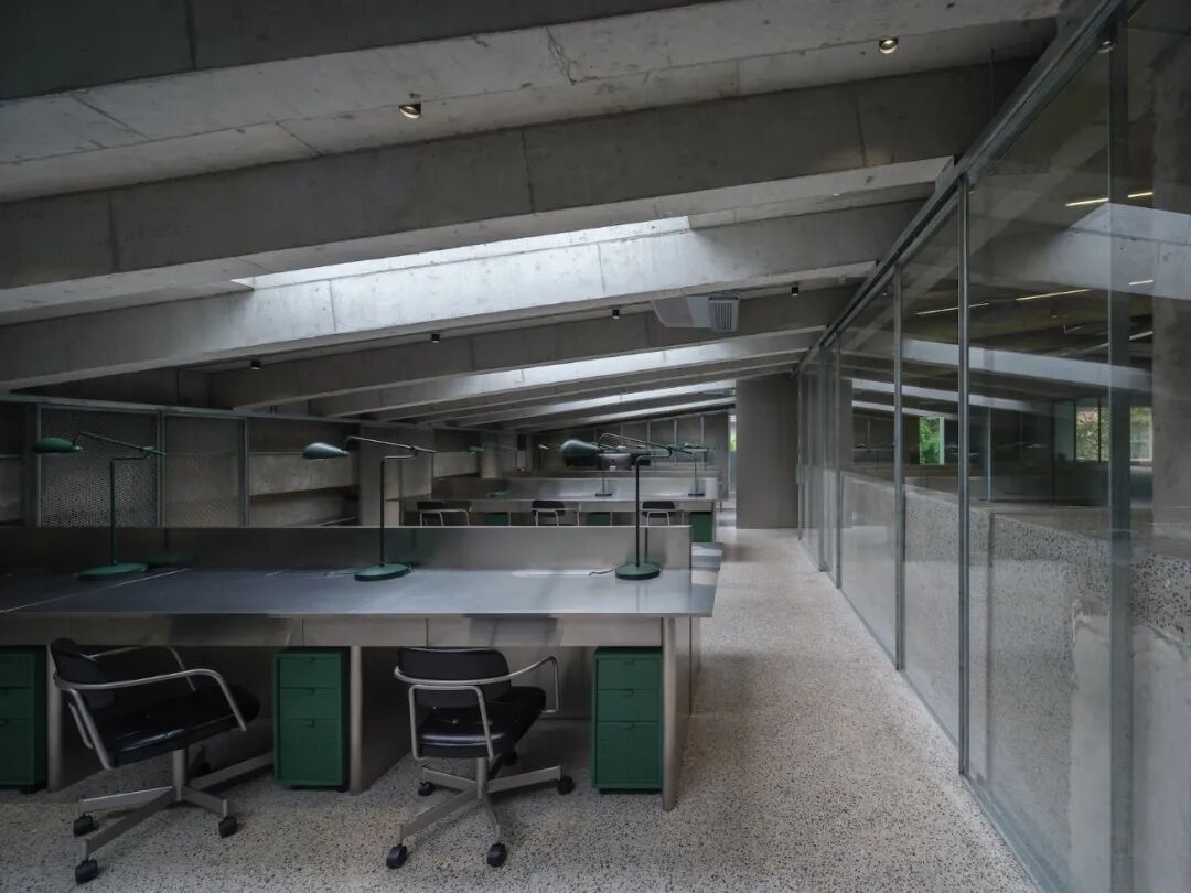 办公空间内的大台阶可以用作演示的座位,屋顶上有一个隐藏的投影仪。两个不锈钢结构围绕着这个主要空间旁边的会议室,而私人办公室则安排在它旁边。一间配有不锈钢书桌的房间,由倾斜屋顶上的六个预先存在的天窗照亮,沿着房间的一个边缘延伸。“随着建筑原始特征的力量显现,空间的任何添加都被仔细地分层应用,让后面的东西共存,栖息在过去和现在之间的边缘空间。”工作室解释说。