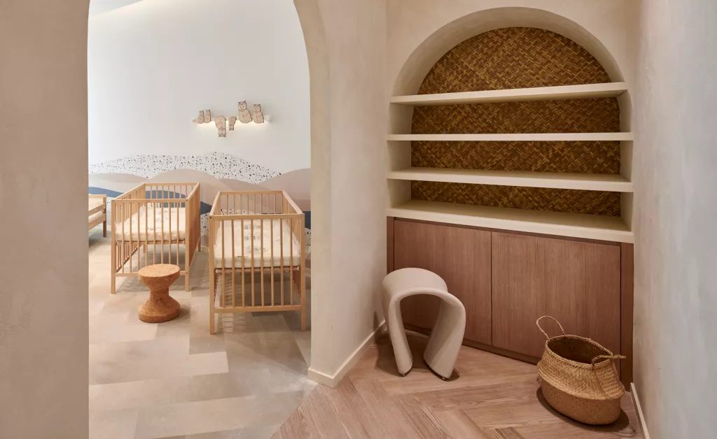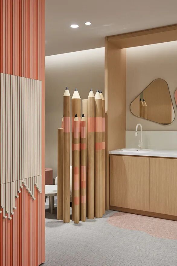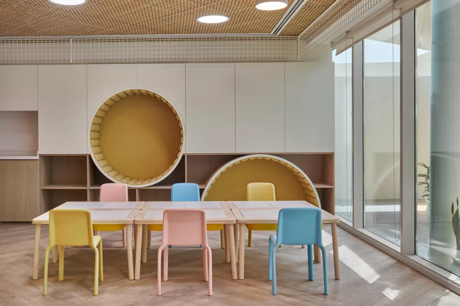 受童年和传统元素的启发,这是一个现代、温馨和包容的空间。接待区户外庭院般的感觉反映了传统的阿联酋设计规范,同时细节上的工艺体现被赋予了现代倾向,以鼓励工作和娱乐;托儿所里还有一面乐高墙和一面攀岩墙,到处都是宁静的色调。它们为经典装饰元素制造了功能性衬托,例如装饰天花板部分的手工 sadu(一种棕榈叶编织的织物)。
