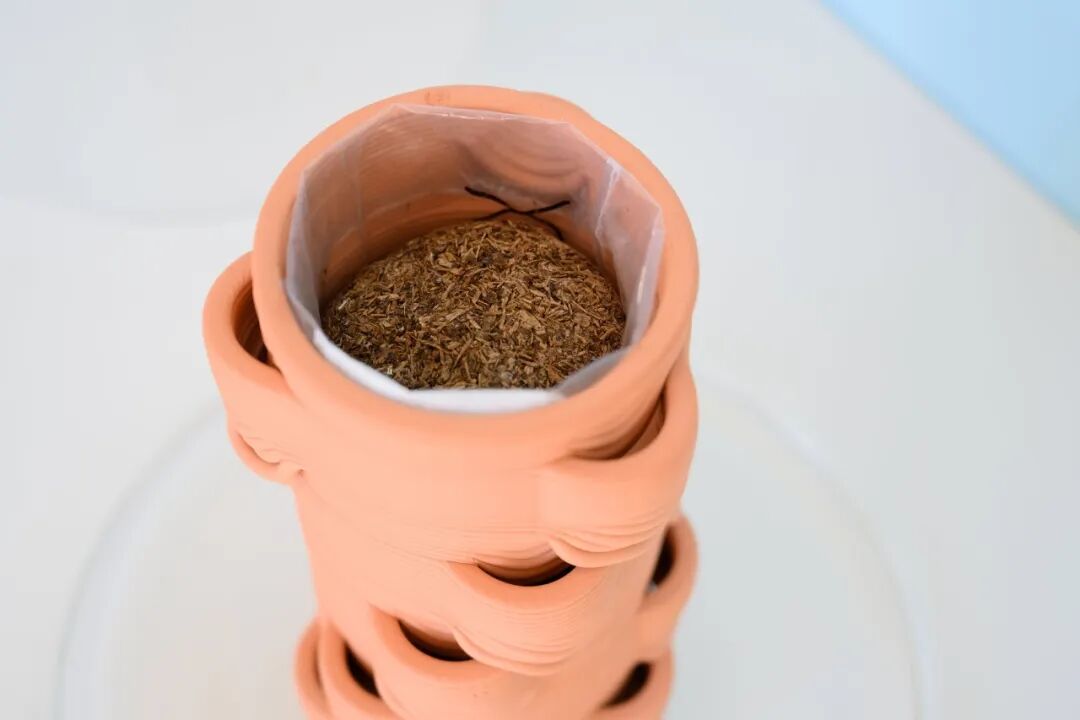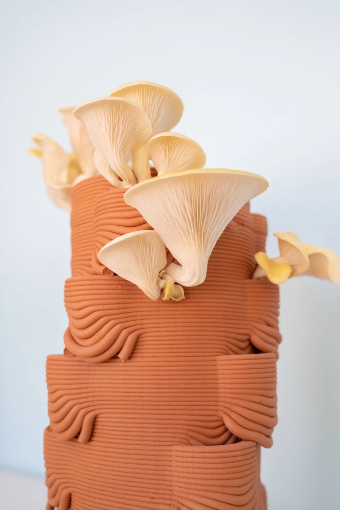 这是一个实用且简单的容器,让人们在家里就可以照顾和滋养蘑菇的生长,并展示它们的独特美感。设计师用陶土和粗陶粘土进行 3D 打印,并大量测试了容器的原型。玻璃外罩的吹制工艺则外包给 Robert Denizen Glass 。产品的使用方法也非常简单,你可以选择各种奇形怪状的容器和蘑菇菌种,只需要简单的操作,便可以期待奇迹的发生。