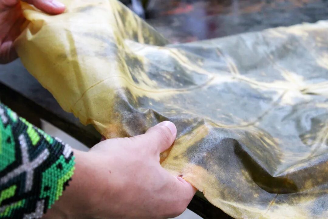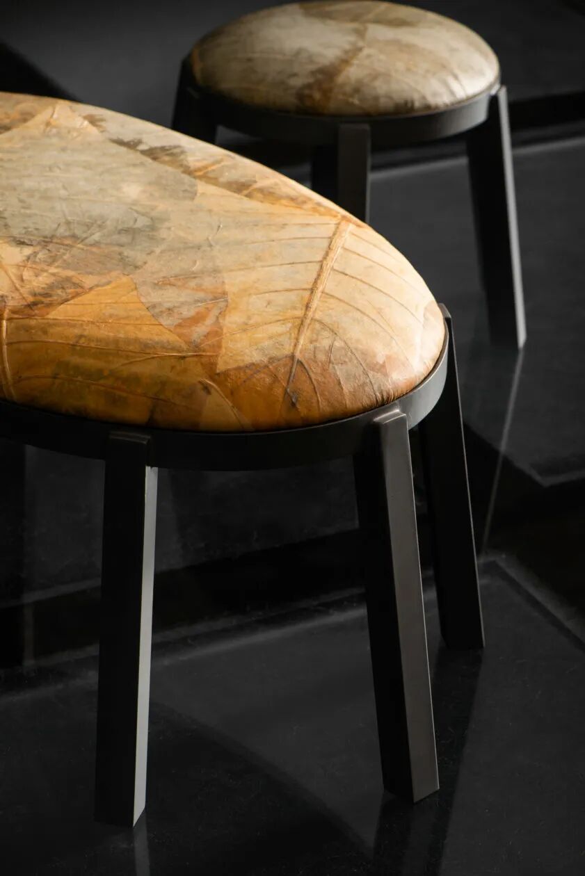 为了展示这种材料的独特来源并引起人们对它的好奇,设计师决定在坐垫表面保持叶子的原始纹理高度可见。这种材料的生产过程涉及不同的阶段:从种植植物到收获叶子,然后晒黑、干燥和压制。与大多数其他植物纺织品不同,叶皮革片不与其他类型的纤维、聚合物或化学品混合,能够保持其外观、纹理和自然形状的美感。