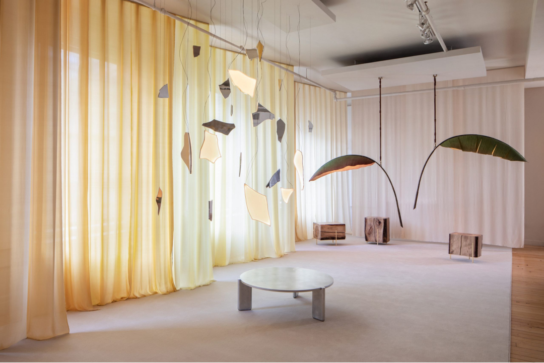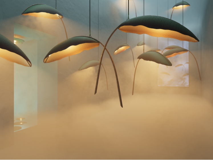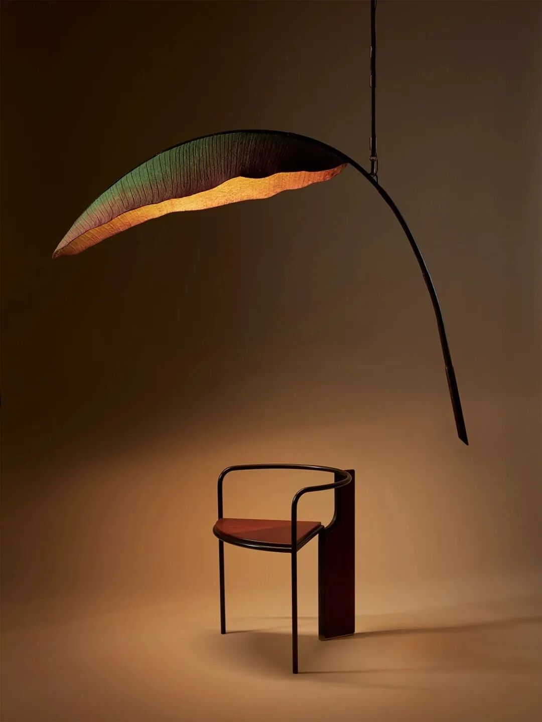 硕大的芭蕉叶轻轻笼罩住光源,散发出幽静的光芒,优雅又富有想象力。关闭时具有热带植物的魅力,打开时就变成了令人惊叹的生动照明。在2022年于巴黎举行的展览上,设计师将无数只吊灯悬挂在如同浸入晨雾的空间之中,将大自然最神秘的景色收入囊中。