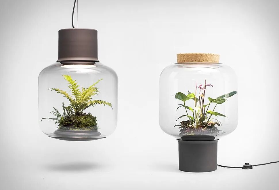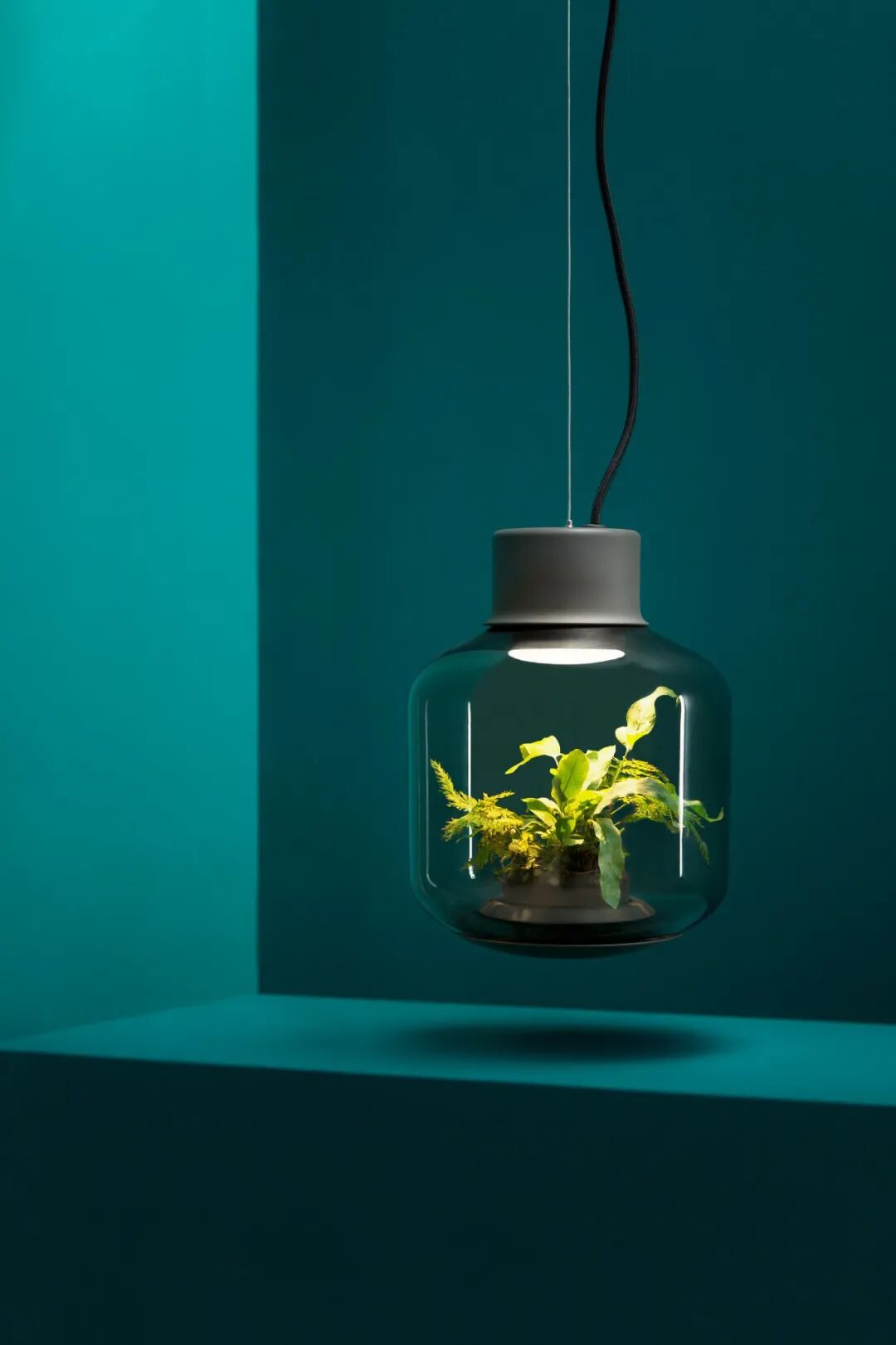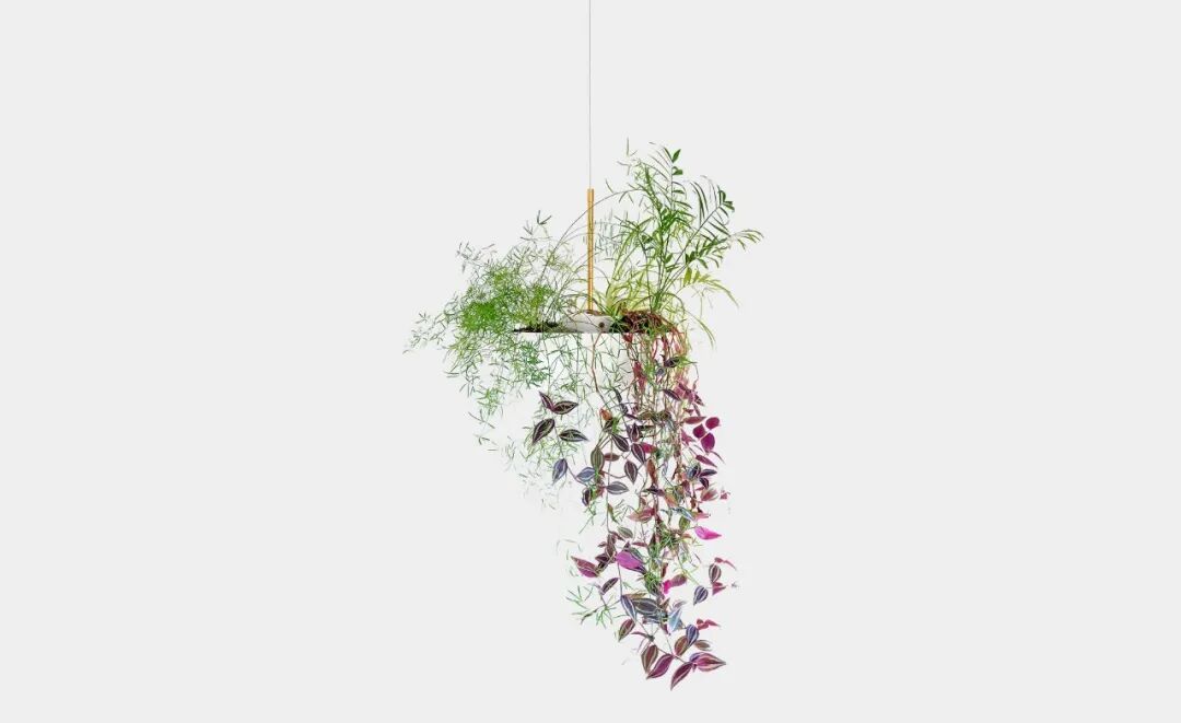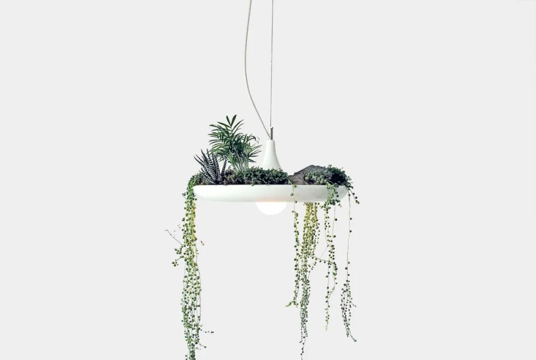 这款吊灯的目的是让室内空间多些自然元素,也将自然带回人们的居住场所。设计师在白色的铝制圆形灯罩上放进土壤和植物,这种灯罩上采用一种特殊的粉末,以便让用吊灯可以维持盆栽的湿度。在不开灯的时候,它就是一个吊挂的盆栽,而当夜晚开灯时,绿色的植物就能在灯光下显得格外青翠。