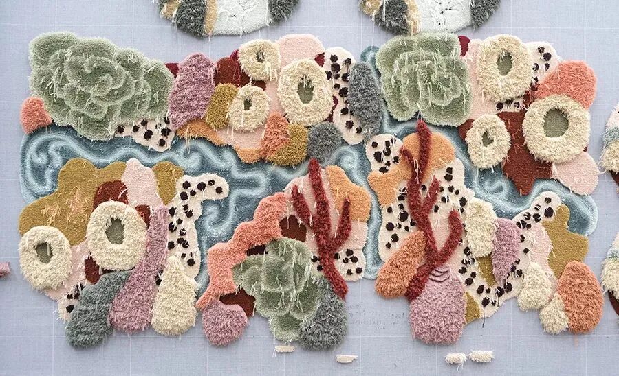地毯绝对是“亲生物设计”中最具色彩表现力的家居产品之一。年轻的 Vanessa Barragão 是一位居住在葡萄牙的生态纺织品艺术家和设计师,制作了许多独一无二的手工挂毯、地毯和壁挂。她利用该行业的回收纱线来进行手工制作,并结合刺绣、钩针、锁钩、花边、编织、针织、毡制和手工簇绒等工艺,在纺织品中创造了一个个神奇的 3D 世界。