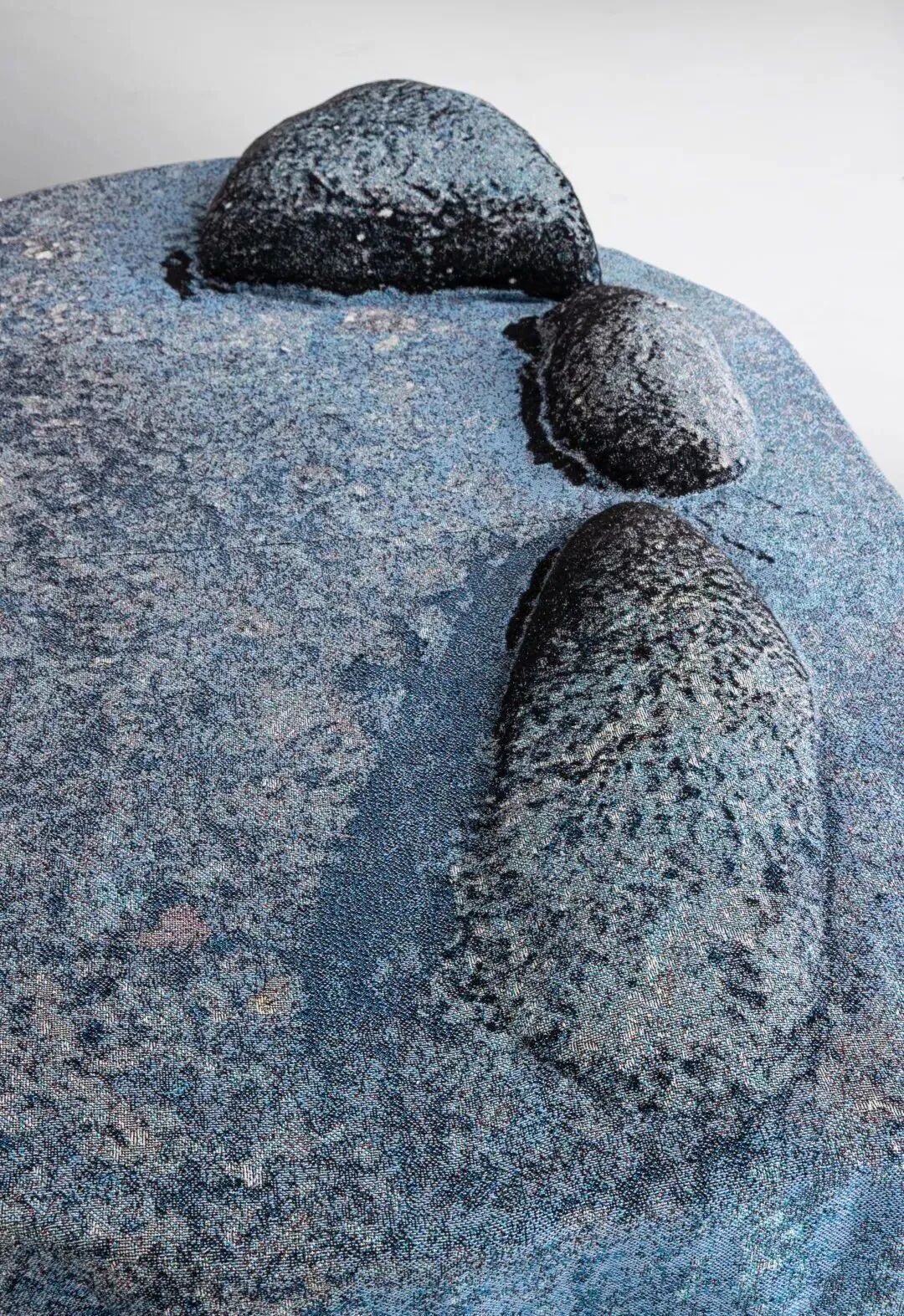 织物的面料是使用不同颜色的纱线制成,以产生斑驳的效果,如长满苔藓的绿色调或岩石灰色调,还有各种蓝色的纱线编织成地海边岩石。除此之外,设计师还研究了由动物建造的结构,包括陶蜂的巢穴,其形状与一对粘土花瓶相呼应。“我们既想收集尺寸和物理特性,也想收集大自然的体验和氛围。”设计师解释道。