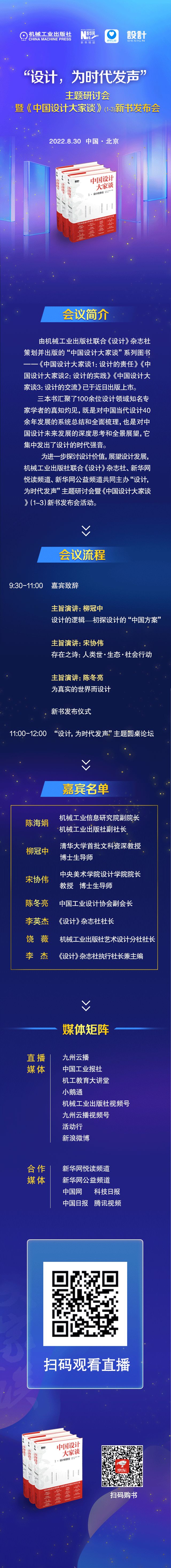 2022年8月30日上午,“设计,为时代发声”主题研讨会暨《中国设计·大家谈》(1-3册)新书发布会将会在京举办。机械工业出版社副社长机械工业信息研究院副院长陈海娟、清华大学首批文科资深教授、博士生导师柳冠中、中央美术学院设计学院院长、博士生导师宋协伟教授、中国工业设计协会副会长陈冬亮、《设计》杂志社社长李英杰、机械工业出版社艺术设计分社社长饶薇、《设计》杂志社执行社长兼主编李杰等领导和嘉宾出席了此次发布会。研讨会由机械工业出版社艺术设计分社社长饶薇主持。